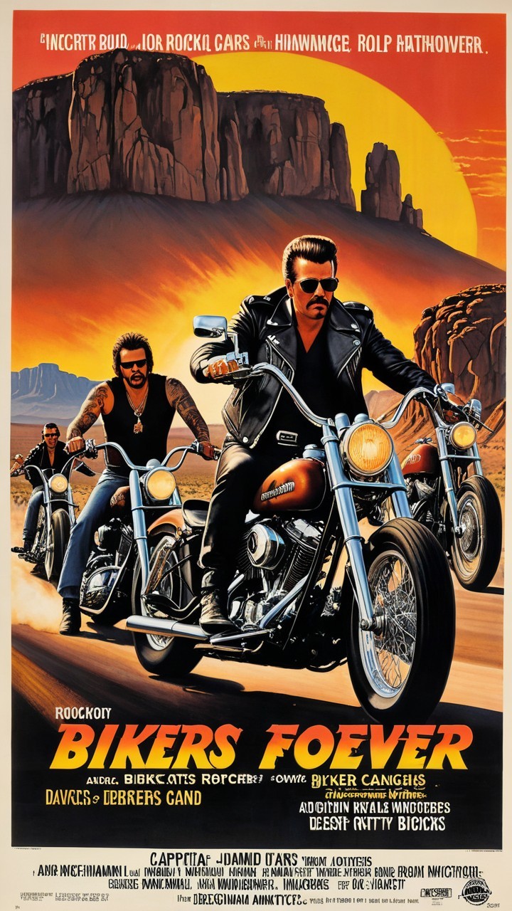 The poster depicts a trio of rugged bikers riding choppers through a desert landscape. Bold, vibrant colors and a retro style convey a sense of freedom and adventure. The title "Bikers Forever" stands out prominently.