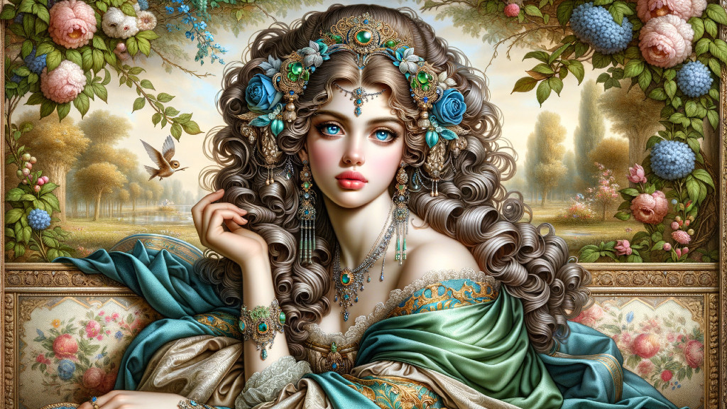 Prompt: "Opulent Turkish princess, poised and regal, enchanting azure eyes, elaborate curls cascading elegantly, luscious cupid's bow lips, adorned in flowing silk robes of azure, emerald, and gold details, set in a candid and natural pose, surrounded by a breezy landscape, vibrant spring flora in full bloom, chiaroscuro lighting enhancing depth and drama, reminiscent of Peter Paul Rubens' style, with a touch of Barbara Jaskiewicz and Catrin Welz-Stein's flair, intricate and detailed digital illustration, rich color palette, capturing a moment of grace and beauty."