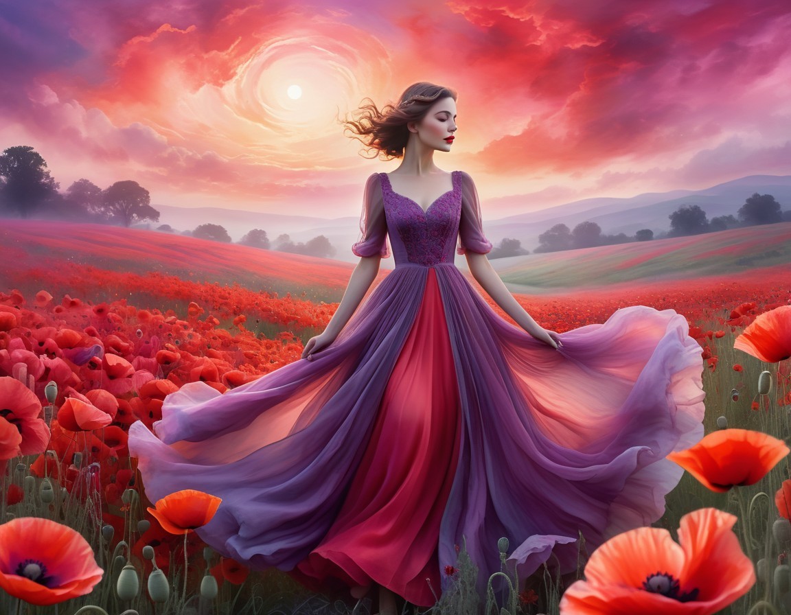 Prompt: "Lush poppy field background, graceful female figure in an elegant dress merging seamlessly with swirling misty skies, vivid red, purple, and pink tones, seamless color gradients, digital artwork, intricate floral details, soft and delicate brushwork, surreal and dreamy setting, mystical lighting casting an ethereal glow, enchanting and captivating atmosphere, fantasy elements subtly interwoven, watercolor-inspired effects, dreamy haze adding a touch of whimsy, Artstation."