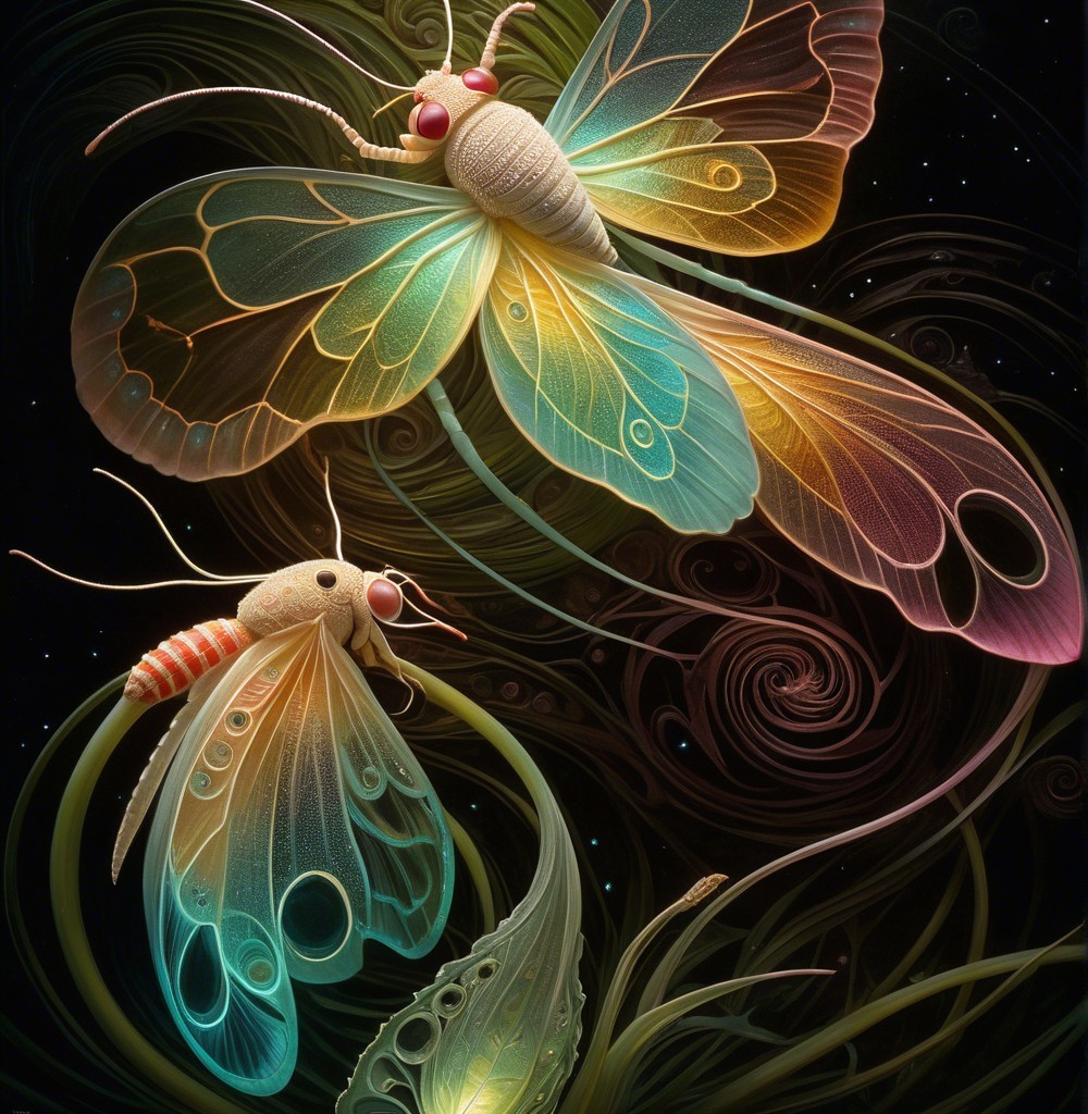 Two intricately designed, colorful insects with translucent wings hover amidst swirling green vines against a dark backdrop, showcasing a blend of vibrant hues and ethereal beauty.