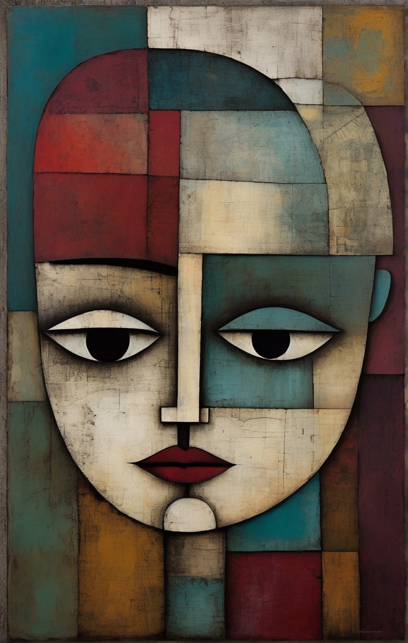 Cubist-style painting of a symmetrical face with geometric shapes and a rich, earthy color palette.