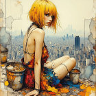 A young woman with short, curly blonde hair poses elegantly in a metallic dress adorned with colorful flowers. The background features soft, reflective surfaces, enhancing her graceful silhouette.