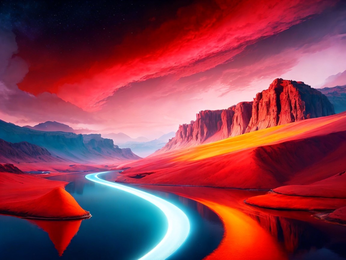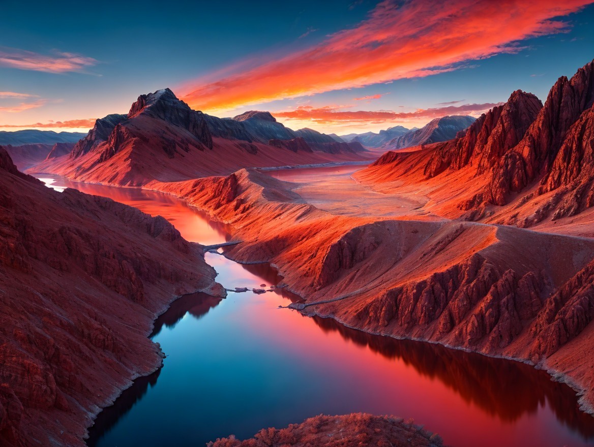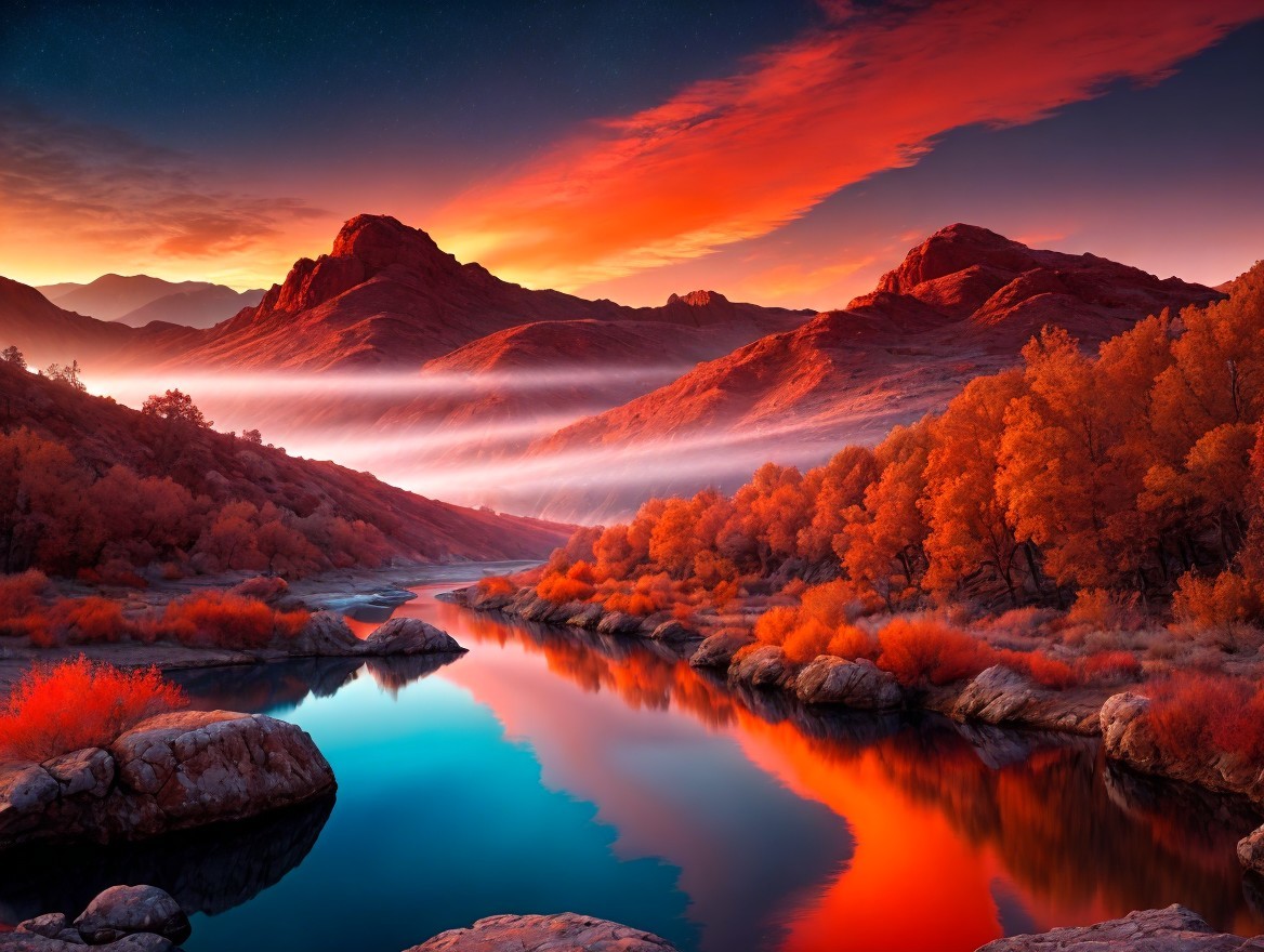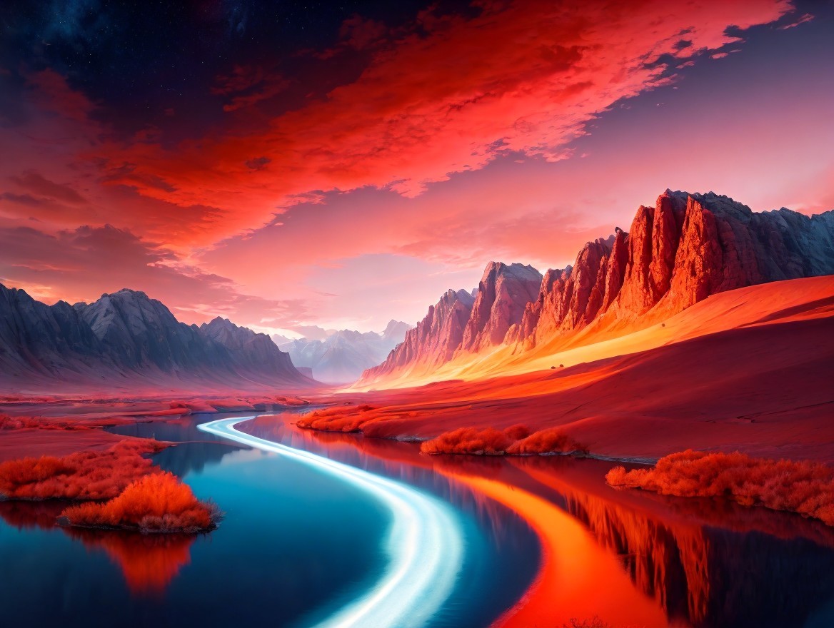 A serene landscape features a winding river surrounded by vibrant red vegetation and autumn hues, under a dramatic sky filled with orange and blue clouds. Majestic mountains loom in the background.