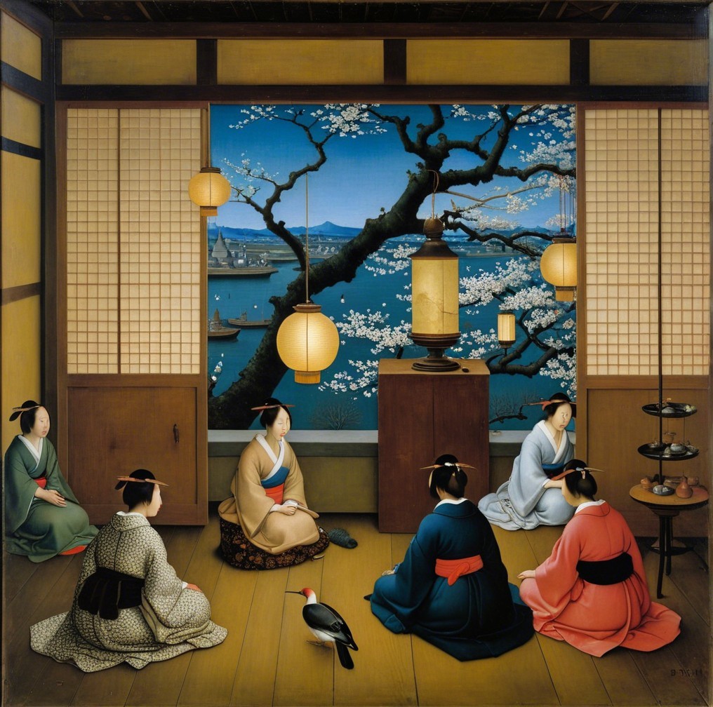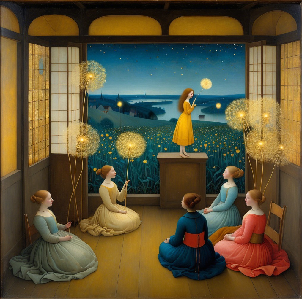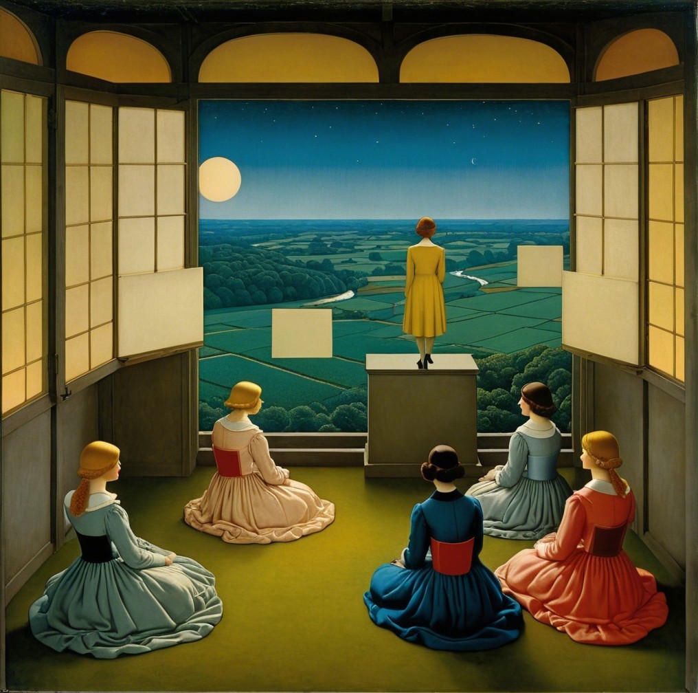 Four women in colorful dresses gaze out from a room with large windows, overlooking a vast landscape concentrating on levitating the woman on the concrete cube.