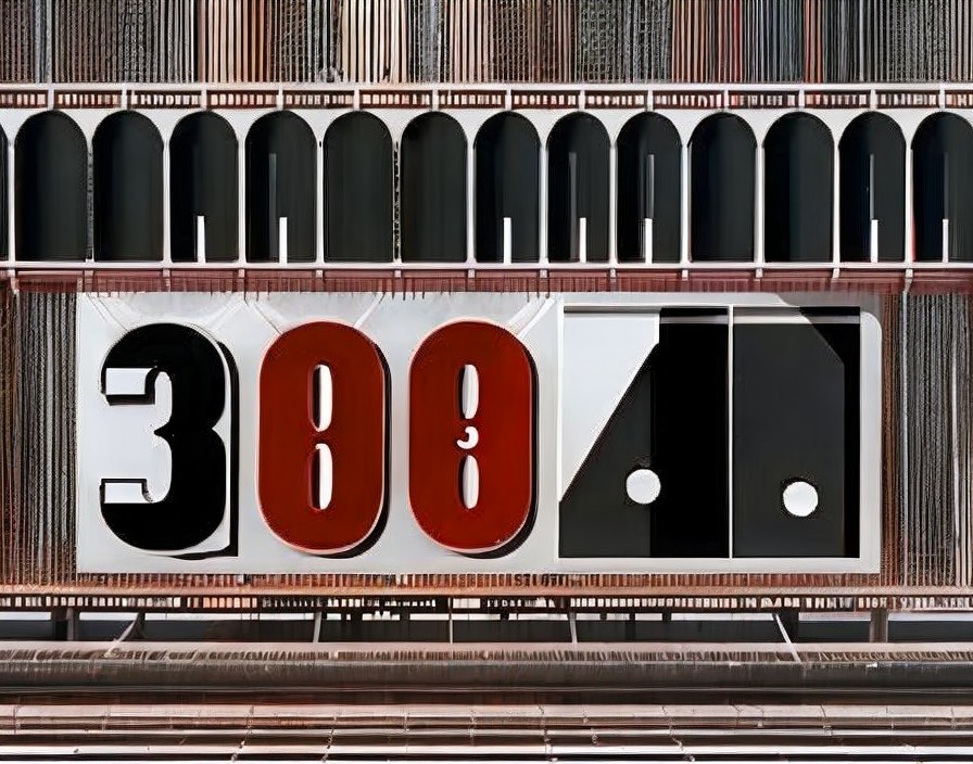 Sleek interior with reflective metal surfaces and the numerical pattern "2001" prominently displayed in bold, stylized figures.