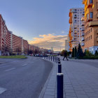 A modern cityscape at sunset, featuring tall apartment buildings lining a bustling street. Cars are parked, and a person walks toward the horizon, framed by neatly landscaped greenery.