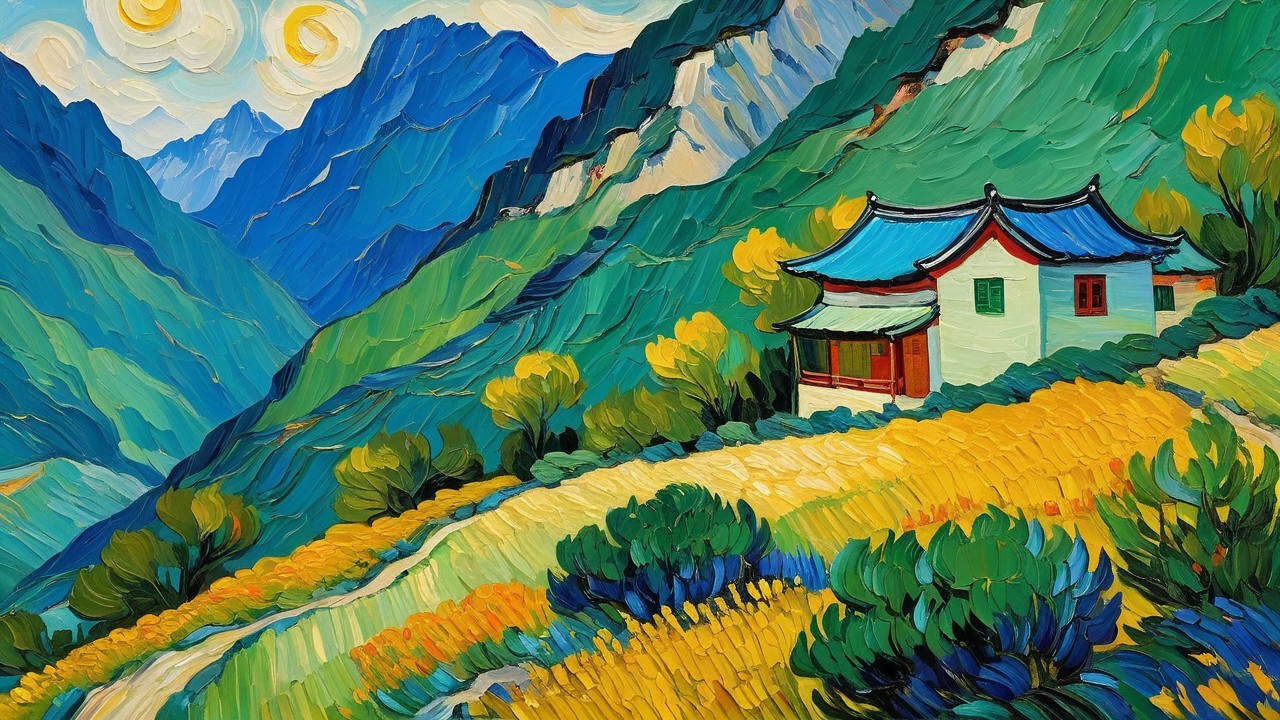 A vibrant, impressionistic painting captures a charming village amidst undulating mountain terrain. The left side is dominated by a majestic blue mountain, its peaks reaching towards the sky, with green slopes softening its base. A traditional Japanese house with an azure roof and a white facade, accented by red window frames and a