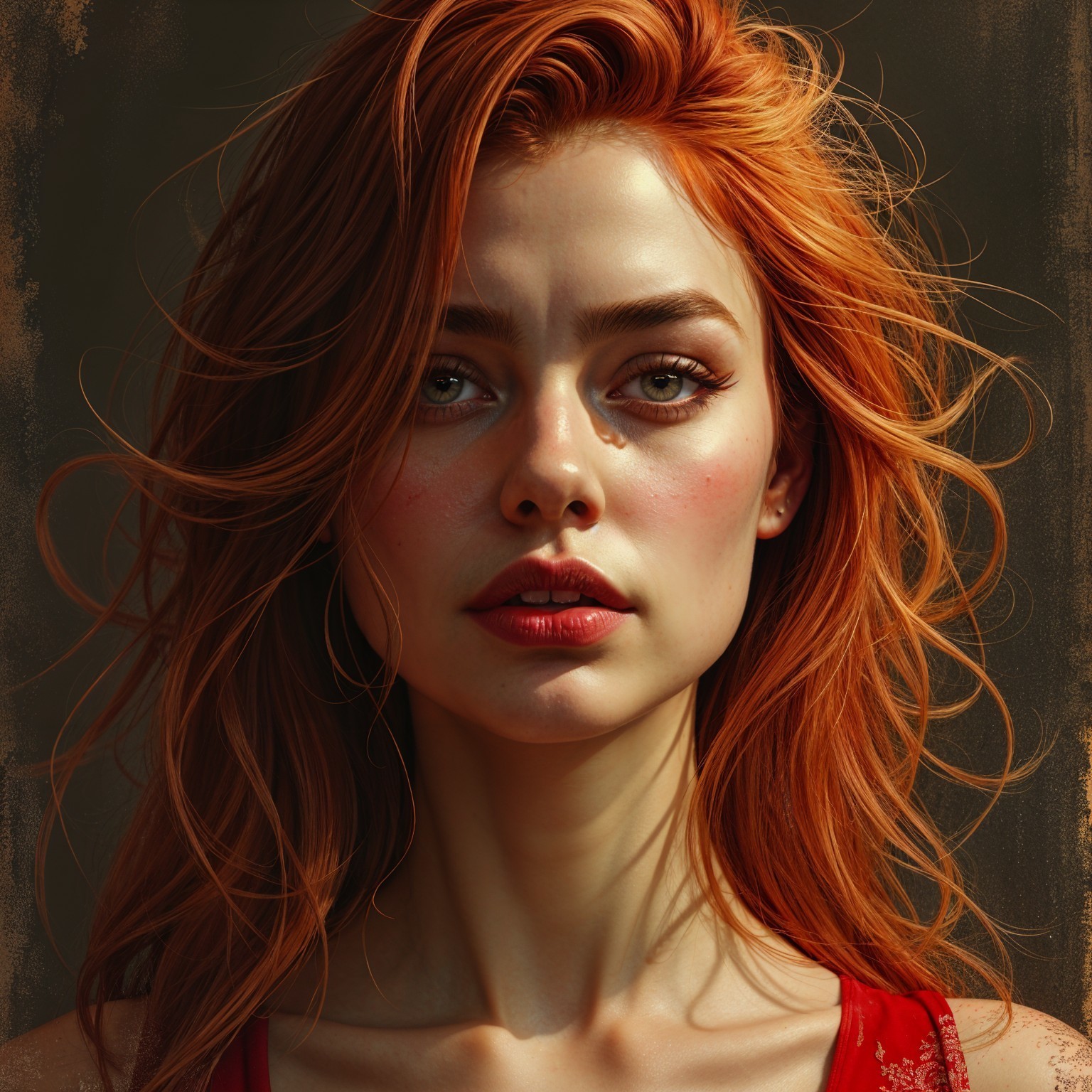 This digital painting features a stylish femme fatale with long, wavy red hair and mesmerizing eyes. Her serene yet introspective expression contrasts with a dark background, enhanced by vintage brown tones and golden-yellow light. The impressionistic style showcases expressive brushstrokes, creating depth and texture. Dressed in a red rustic dress, she strikes an elegant pose