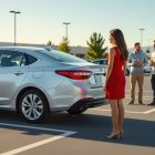 Young woman in red dress by silver car in parking lot