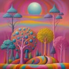 Surreal Landscape with Colorful Trees and Geometric Hills