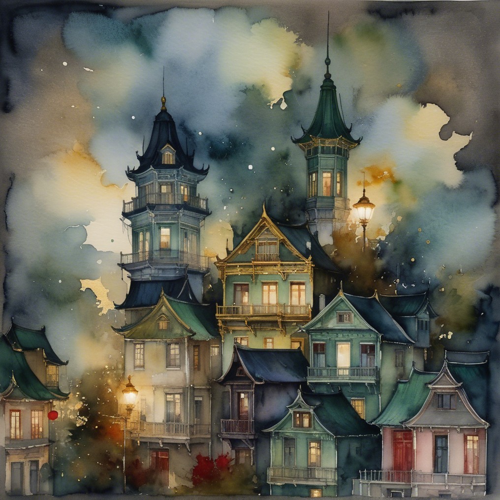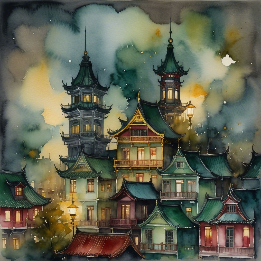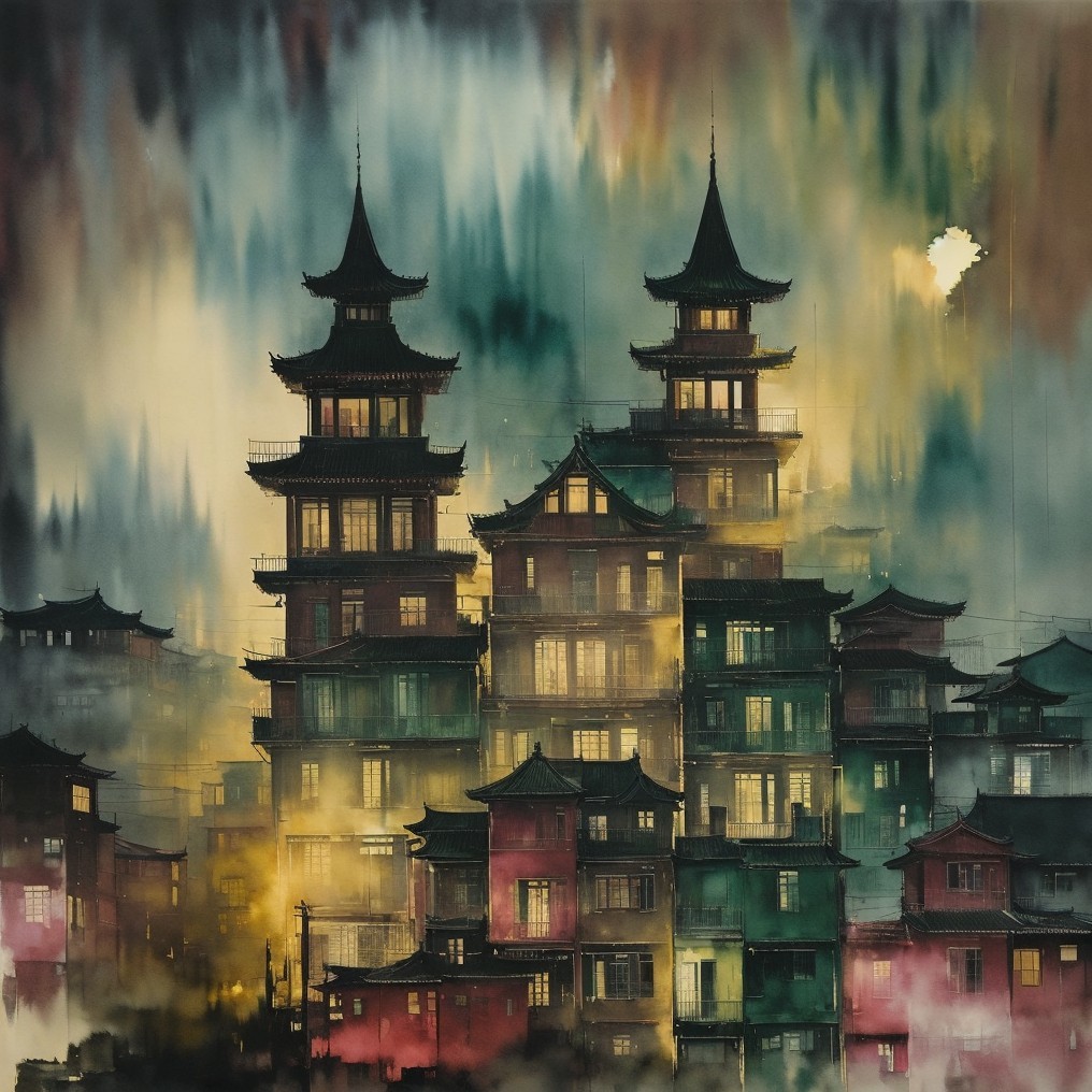 A vibrant cityscape blends traditional and modern architecture, featuring colorful pagoda-style buildings amidst tall, illuminated skyscrapers. The atmosphere is enchanting with mist and glowing lights.