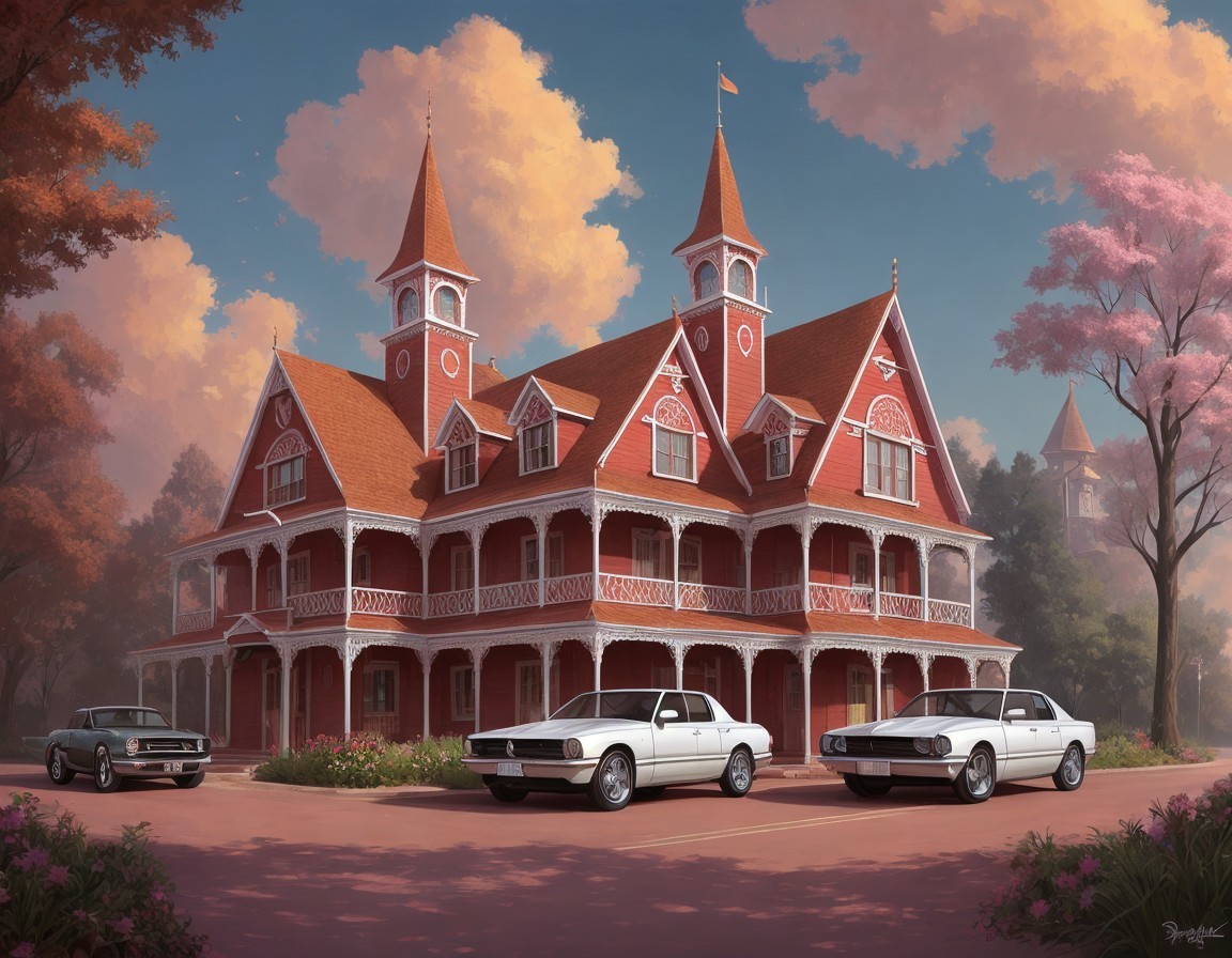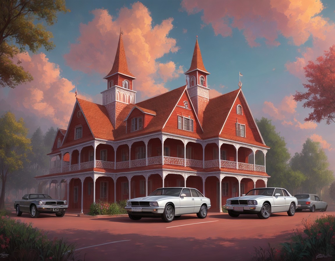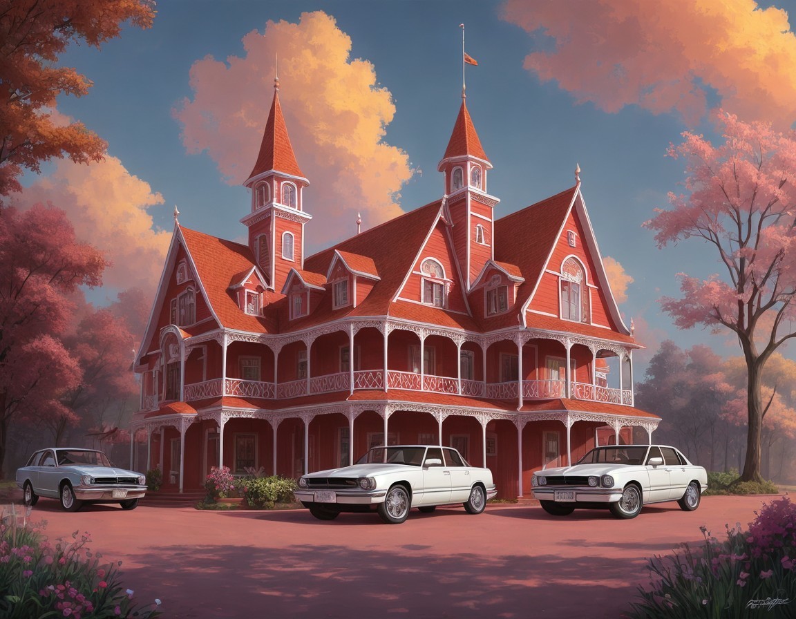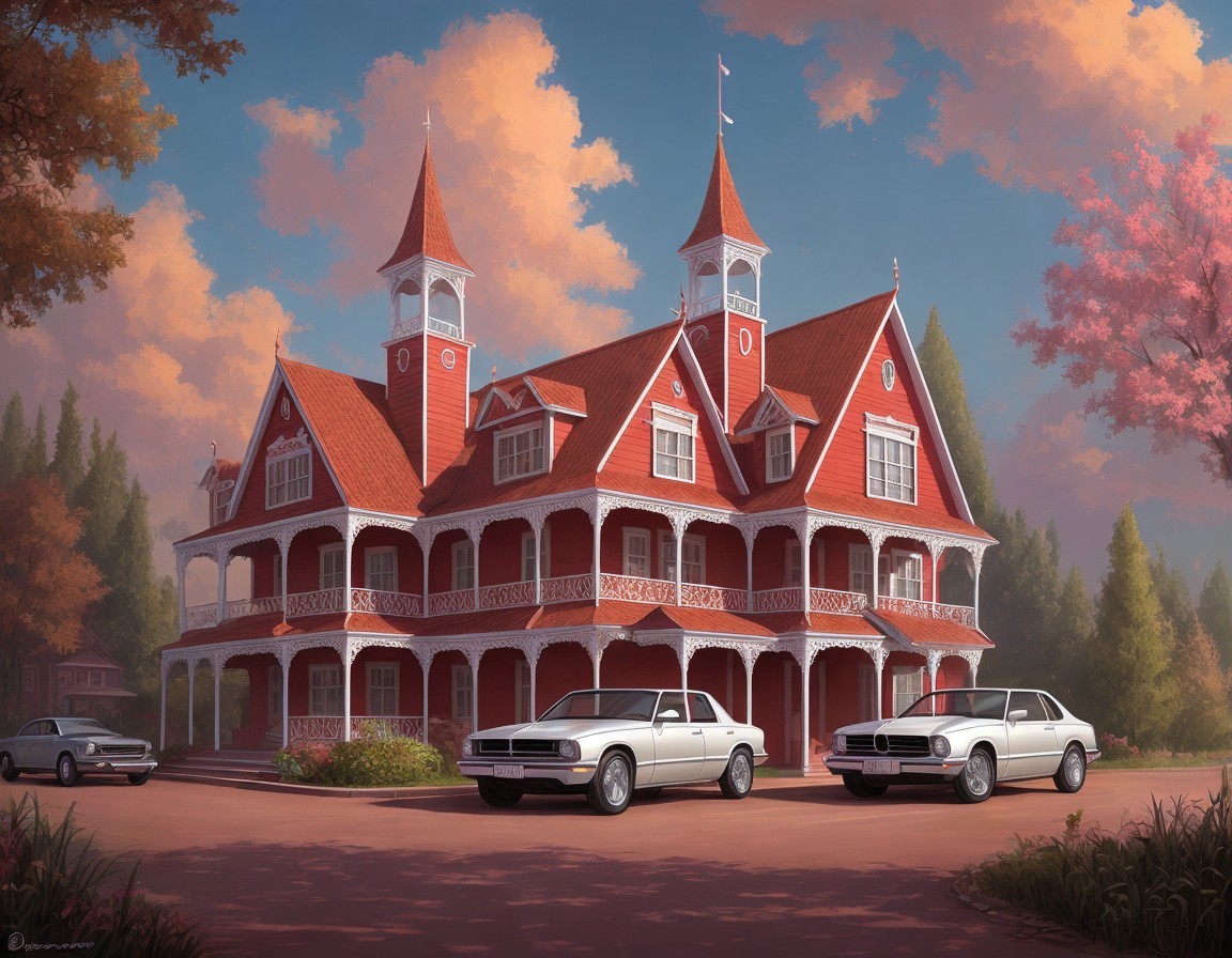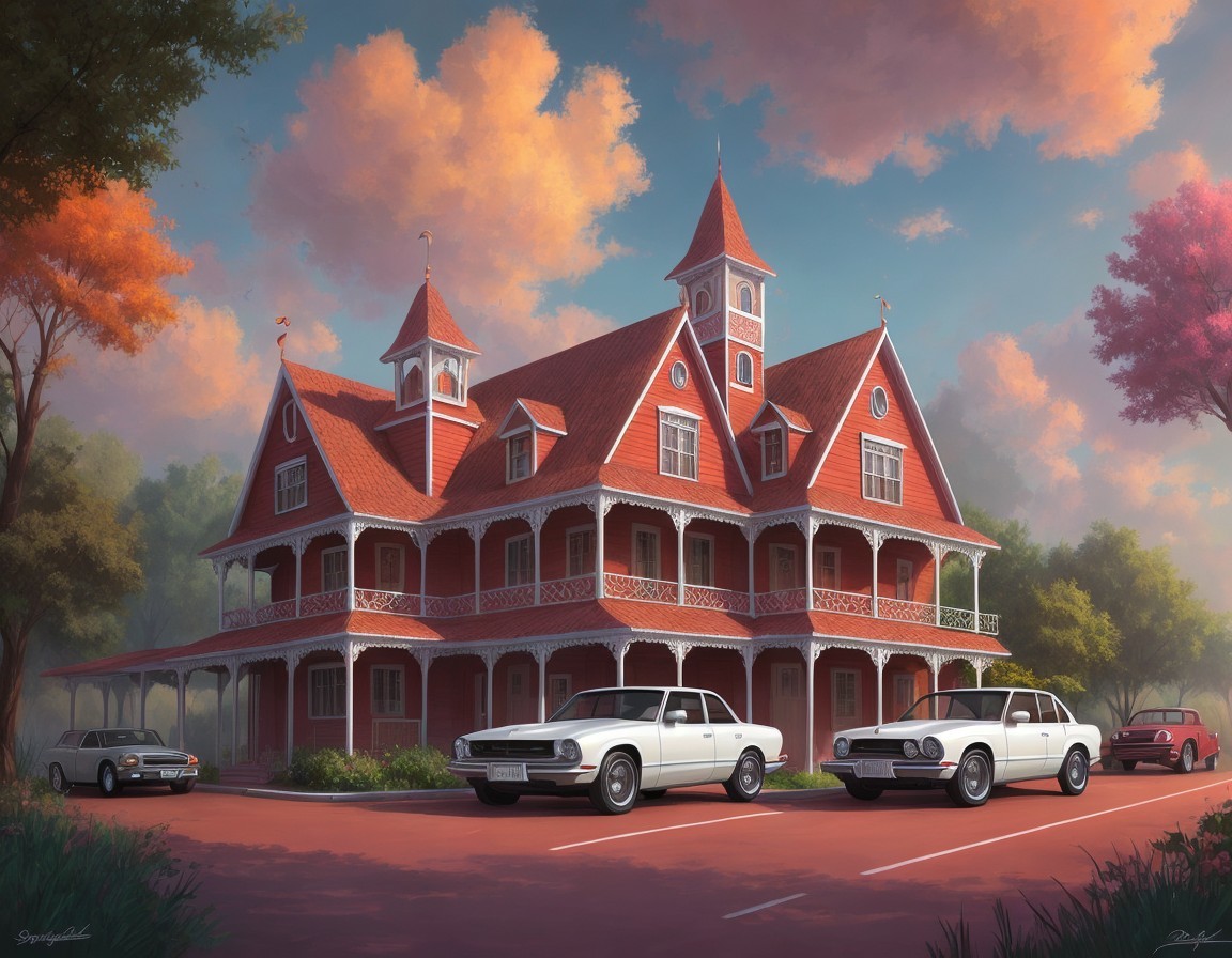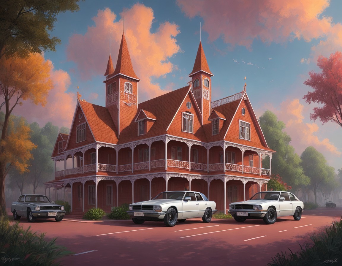 A Victorian-style house with pointed roofs and a wraparound porch is set against a backdrop of fiery autumn trees and hazy sky, flanked by two vintage cars.