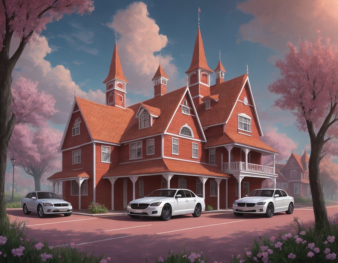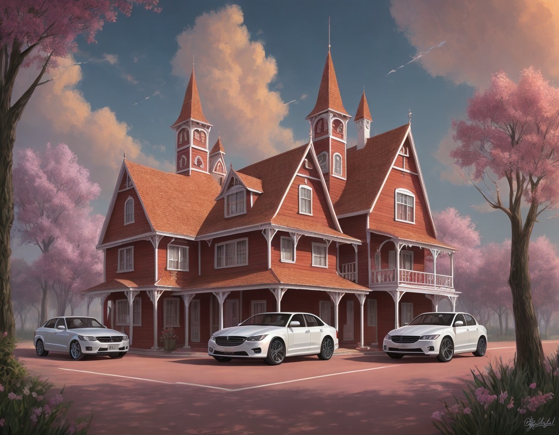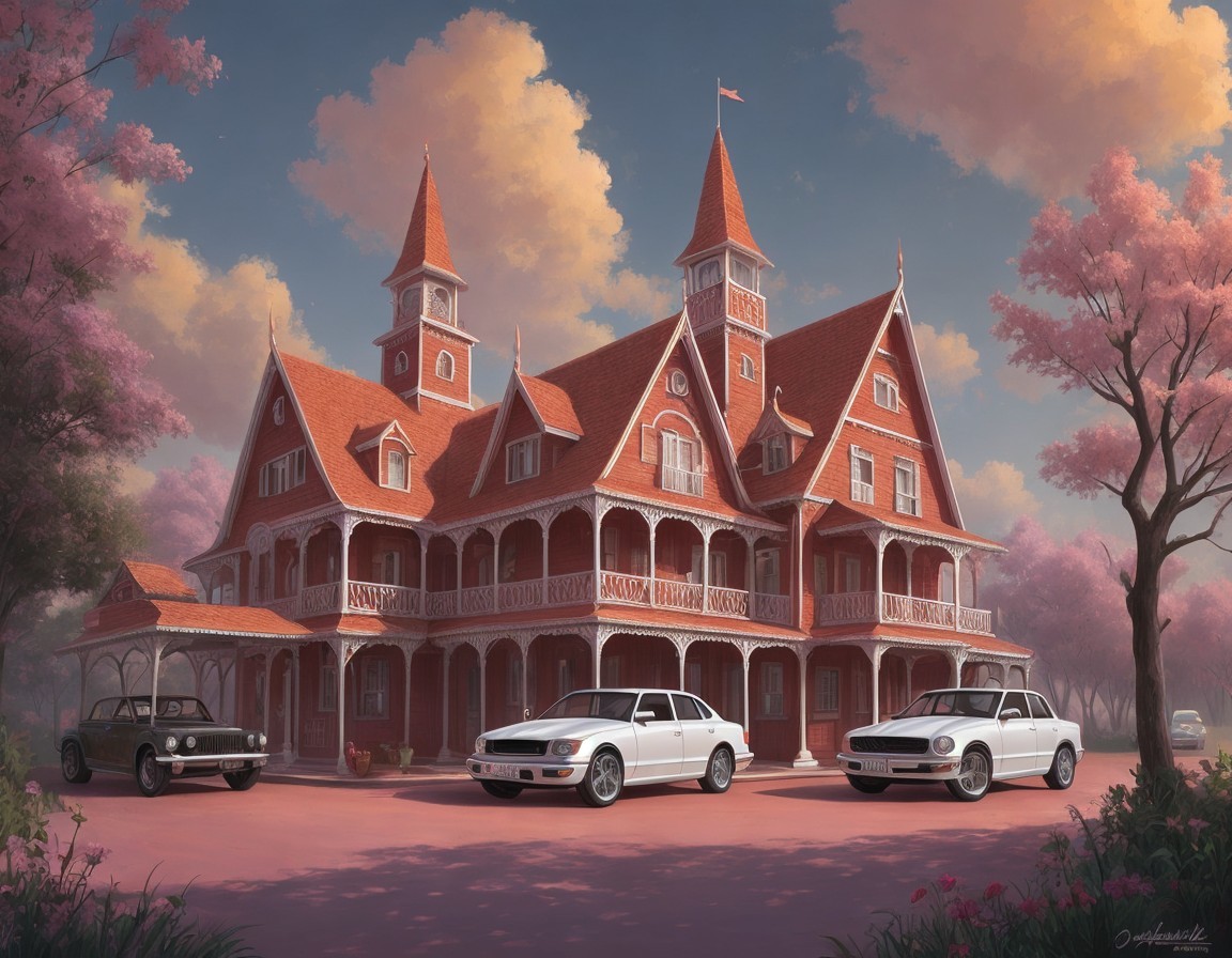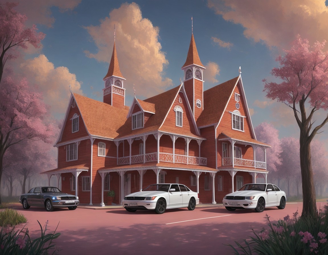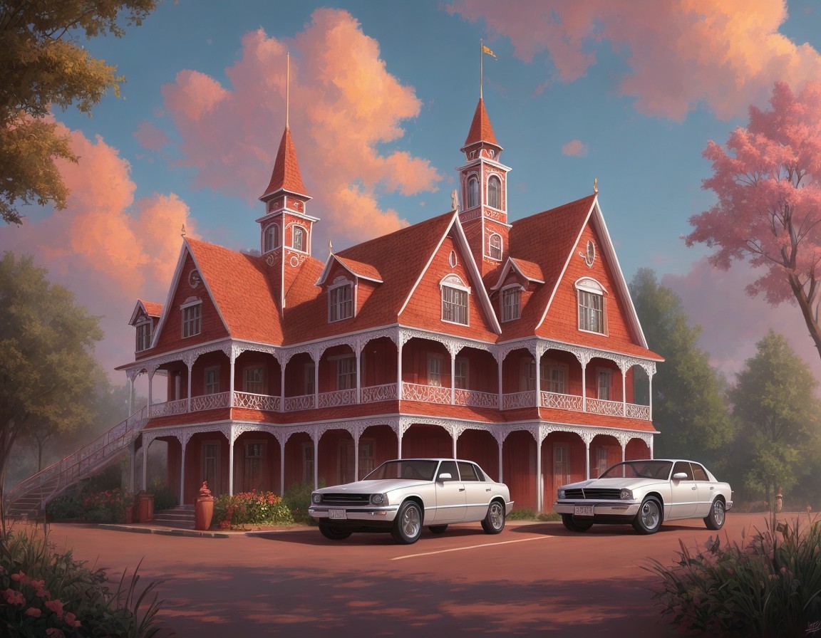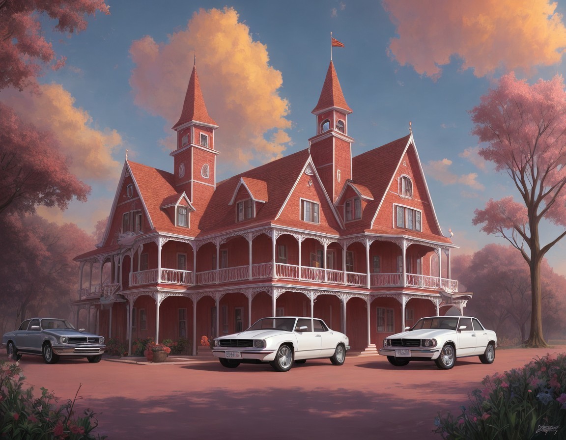 A Victorian-style house with pointed roofs and a wraparound porch is set against a backdrop of fiery autumn trees and hazy sky, flanked by two vintage cars.