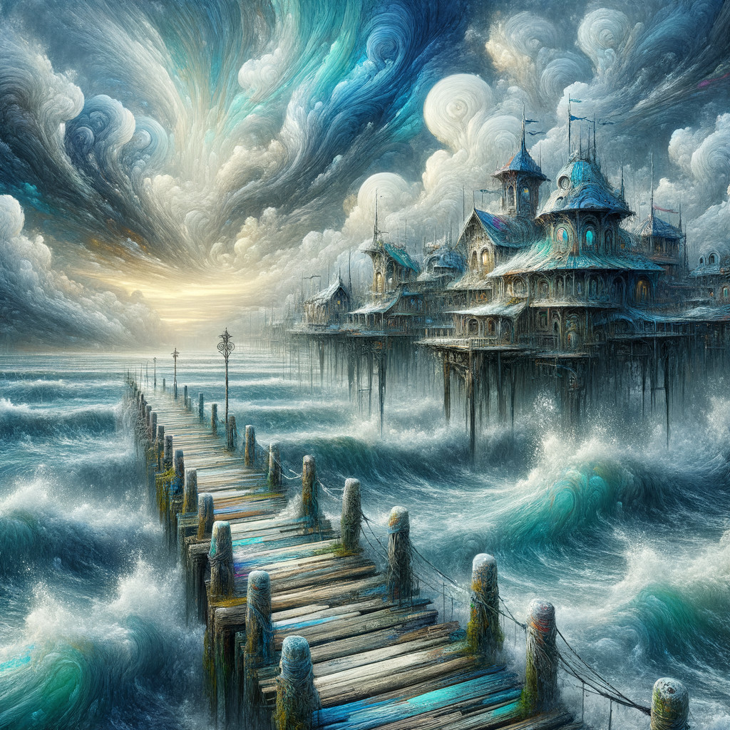 A whimsical depicton of the first pier. pier surrounded by the ocean, a ship in the distance, and vibrant colors.