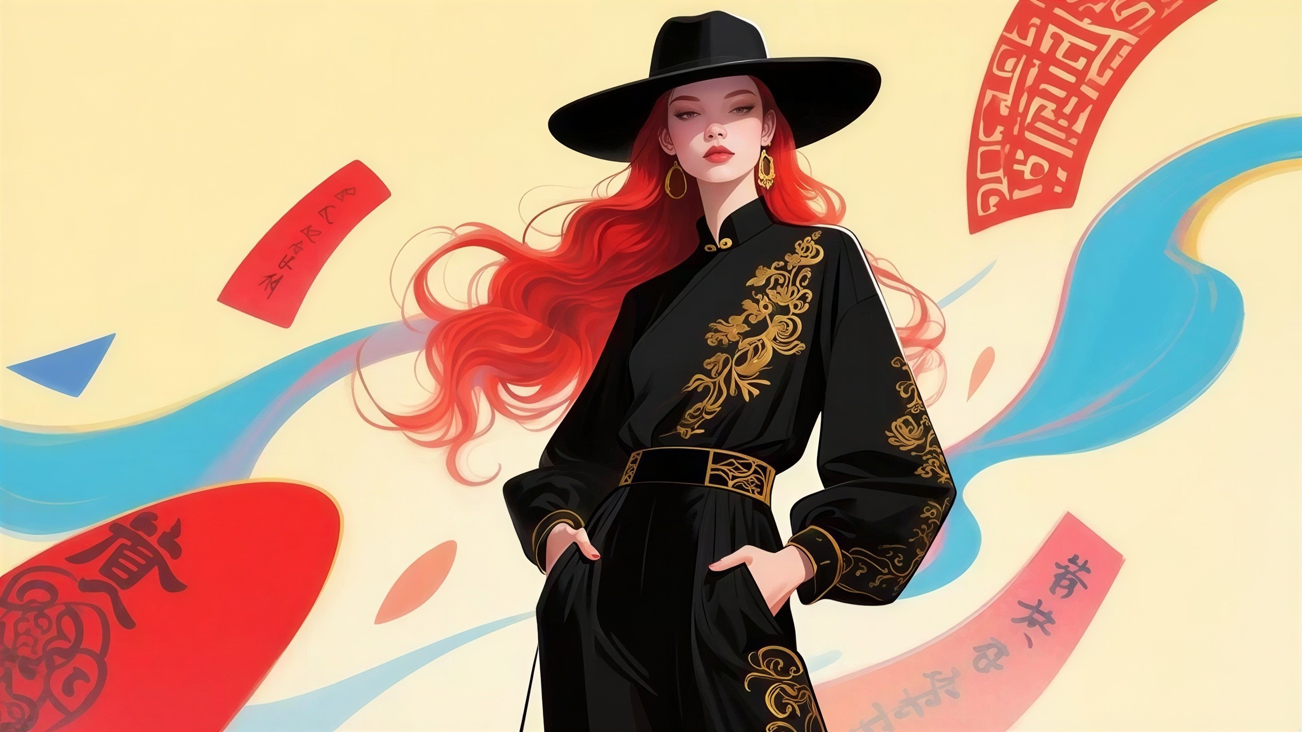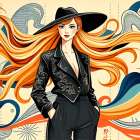 ((((Mastery)))), a multi-block woodcut and linocut in the style of a classic Oriental print (e.g., Ukiyo-e or Chinese folk art). The illustration depicts a confident woman in a modern, sharp pose, her form defined by a bold, black key block of energetic, flowing lines that capture movement. She wears a stylish, wide-brimmed hat and a fashionable suit: an intricately embroidered jacket and high-waisted trousers, suggested by thick, clean lines of indigo and charcoal. Her most striking feature is her long, wavy hair, which flows seamlessly in a layered transition of colors—from gold at the roots, through warm orange, to soft pink at the tips—achieved by transparent, overlapping layers of ink. Around her figure swirl abstract patterns and flowing lines in complementary colors such as electric blue, bright magenta, and citrus yellow. These elements are deeply engraved into the woodblock with a combination of fine line drawings and decorative, organic motifs that mimic traditional Eastern patterns (such as clouds, flowers, or waves). The background is deliberately minimalist: a soft, solid surface of pale gray or ivory, printed with a subtle textured pattern resembling rough handmade paper. This allows the vibrant colors and dynamic lines of the figure to stand out sharply and clearly. The overall atmosphere is one of stylish, contemporary confidence, interwoven with Eastern graphic elegance. An award-winning piece that balances fashionable illustration with expressive, traditionally inspired energy. Ukiyo-e, woodcut, linocut, keyblock, thick outlines, flat colors, graphic style, modern, Eastern aesthetic.