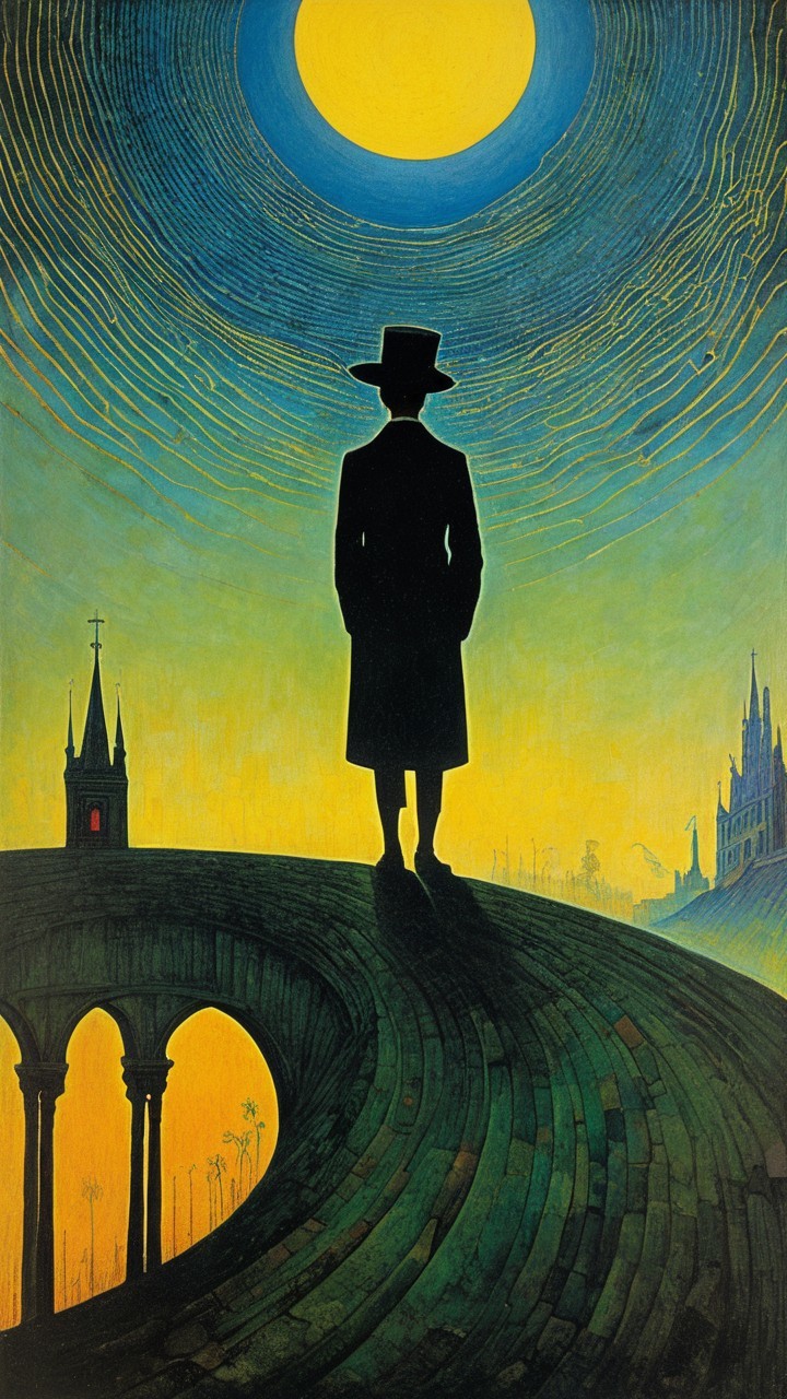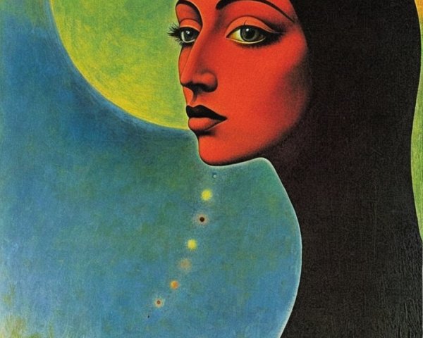 A striking portrait of a woman with a deep red face and captivating green eyes, set against a vivid background featuring a large green circle and silhouettes of figures in the distance.