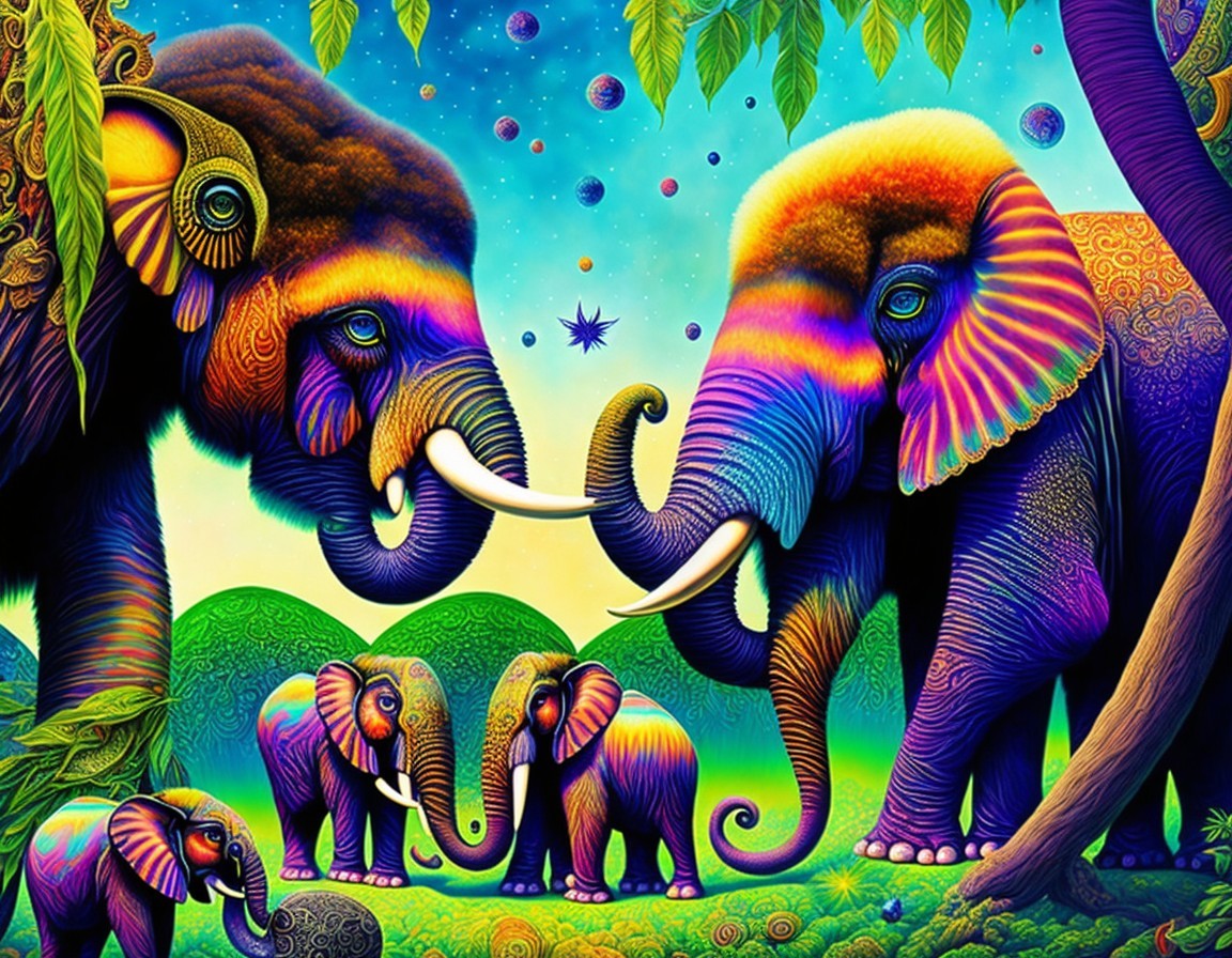 A vibrant, psychedelic artwork featuring colorful elephants amidst a fantastical, cosmic background with planets and stars.