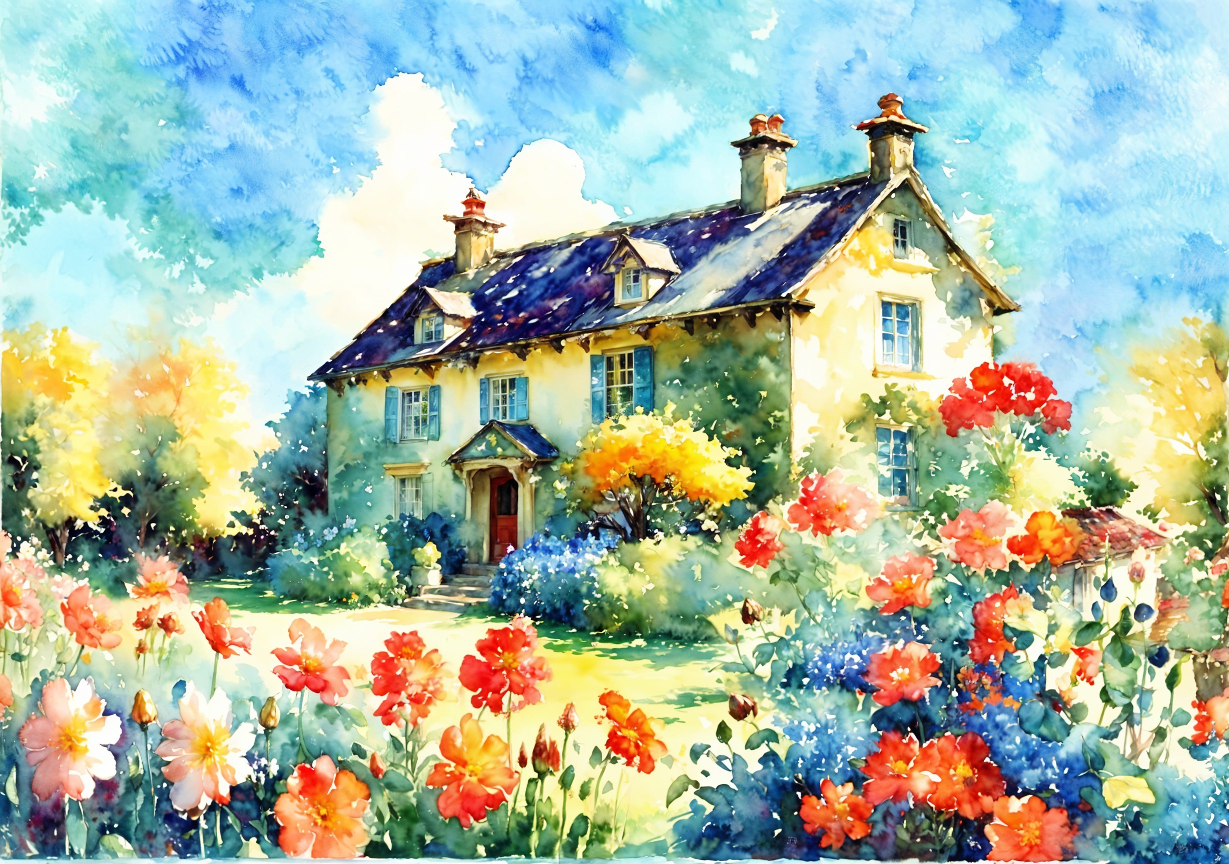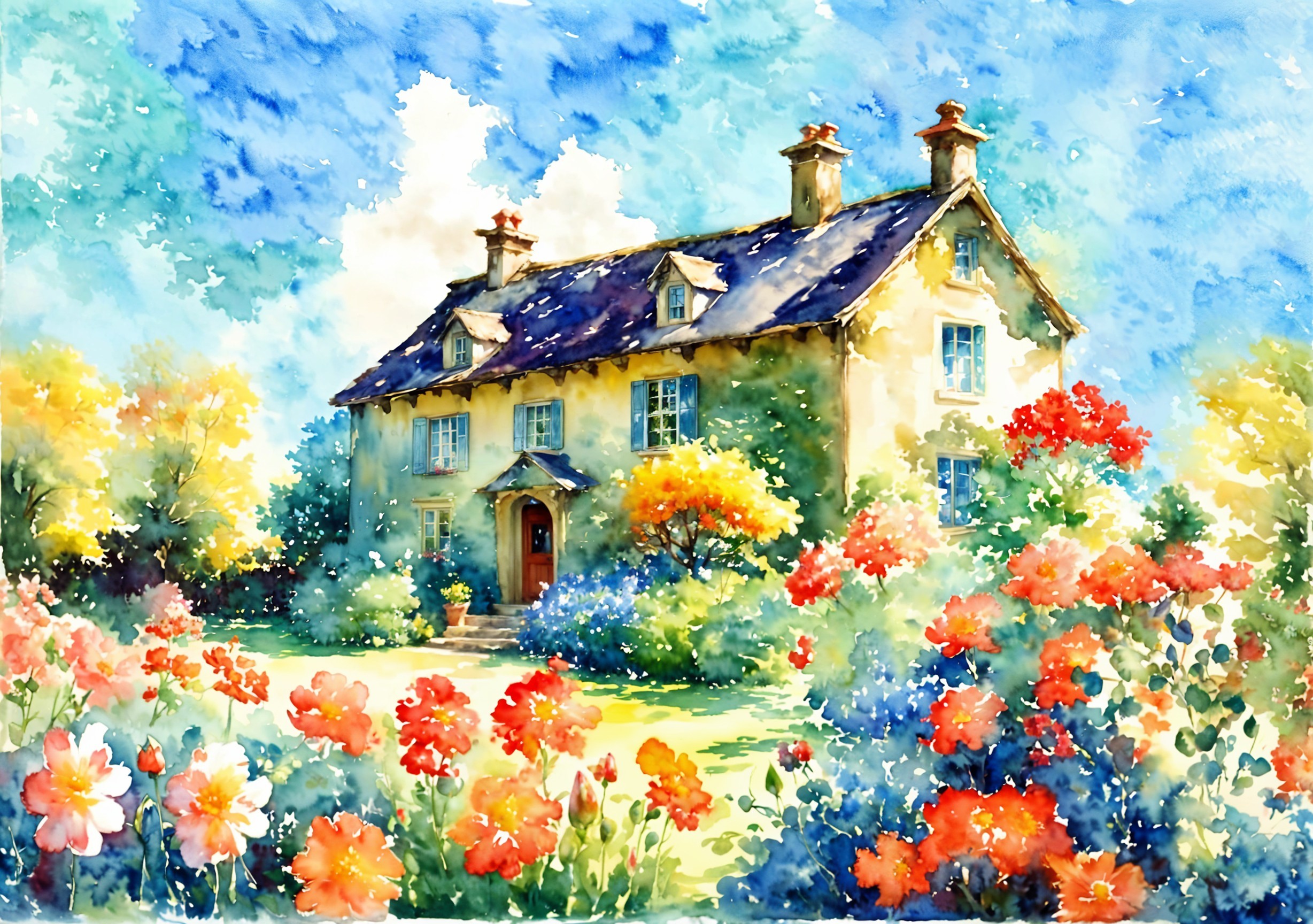 A charming yellow house with a blue roof stands amidst a vibrant garden filled with colorful flowers. The sky is bright and sunny, creating a cheerful, idyllic atmosphere.