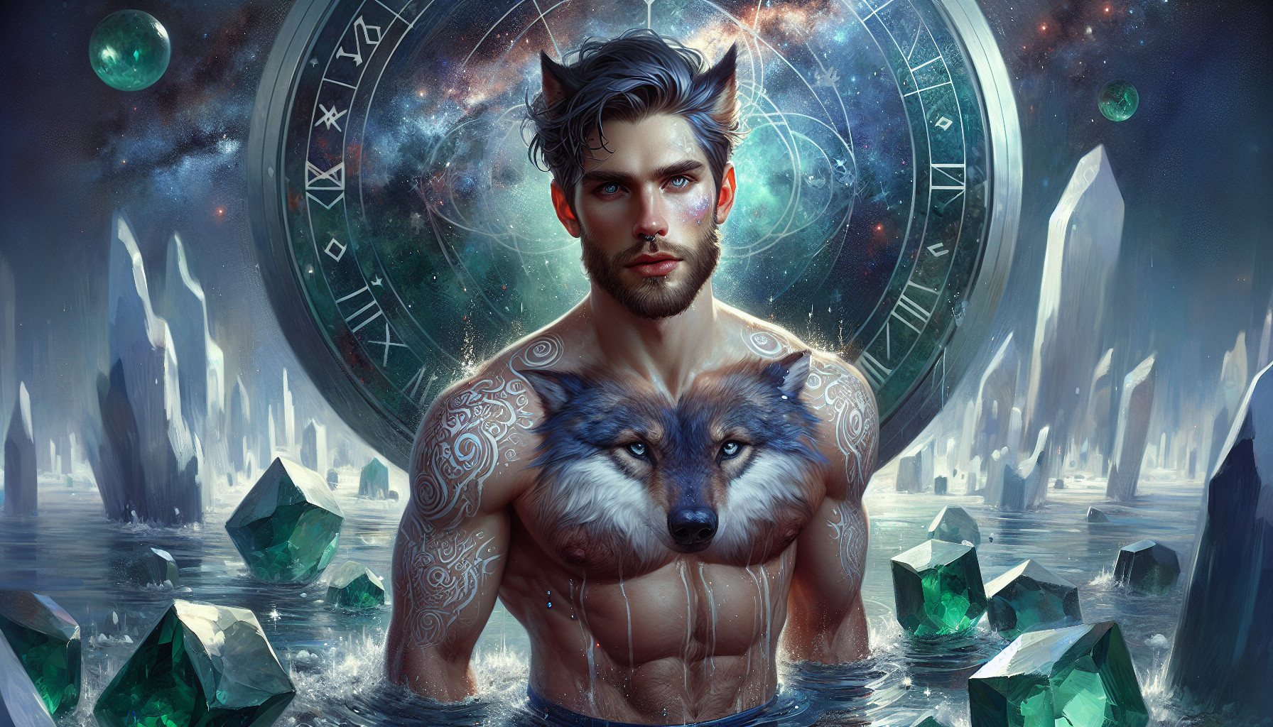 A fantastical male figure with wolf features, surrounded by crystals and a magical aura, set against an icy backdrop.