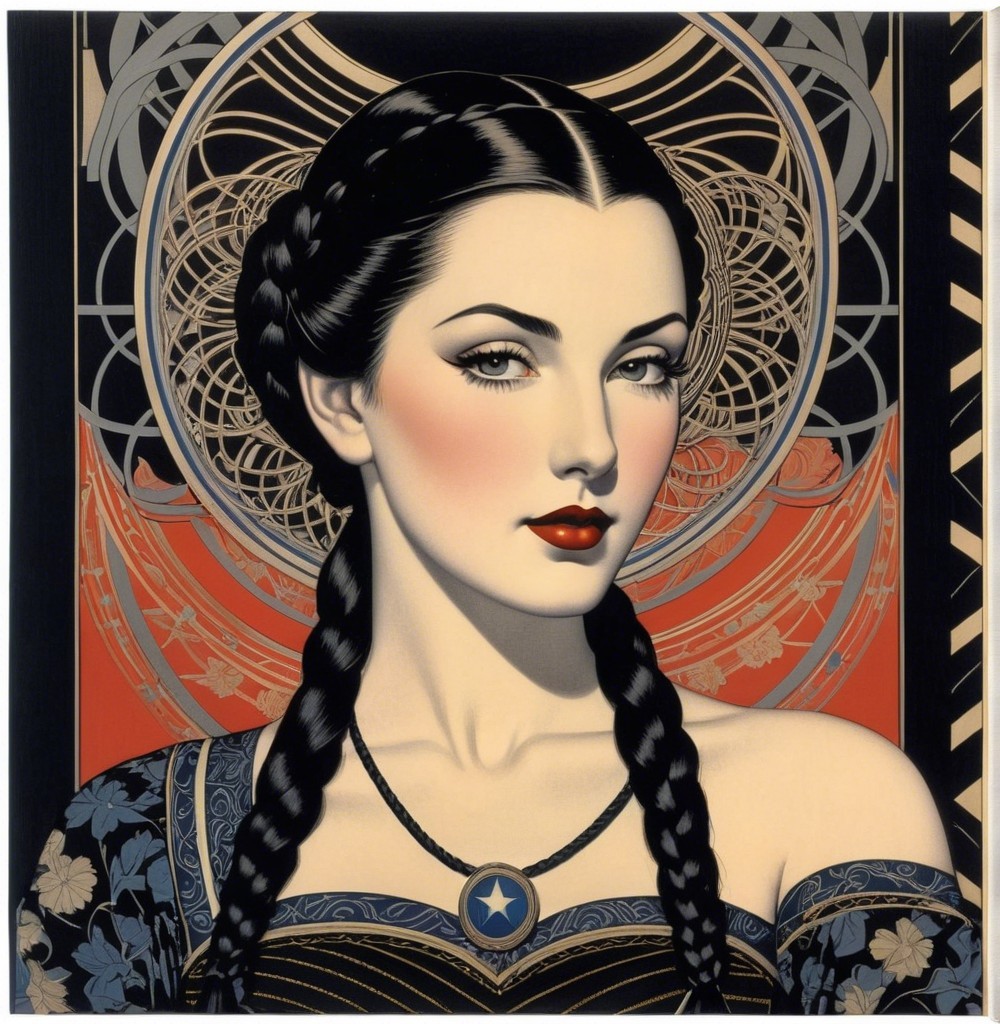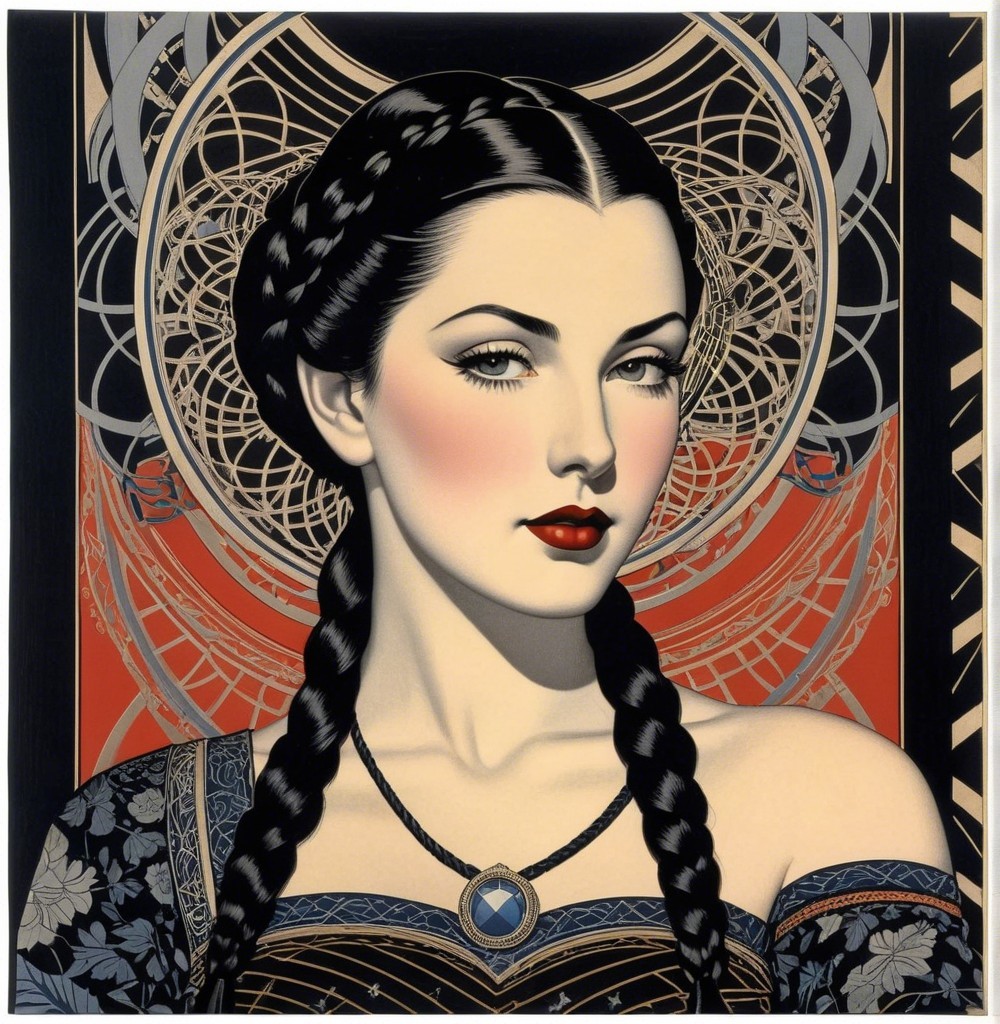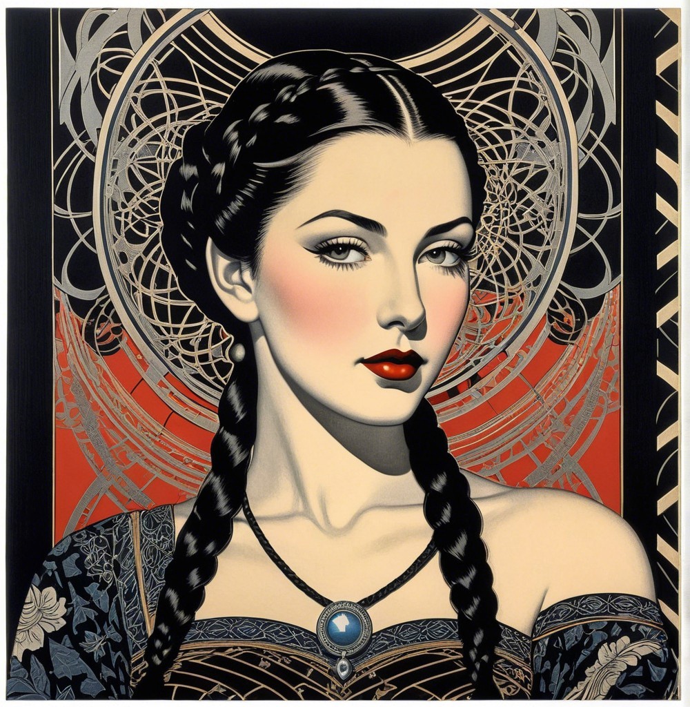 + Prompt:Enchanting Woodblock Print: gothical Rockette with braids, stylized woodblock print by Earl Moran. Hues by Georgia O'Keeffe, portrait features intricate, balanced coloring, stylized details against a geometrical backdrop reminiscent of American Gothic merged with comic book art. Plasticity 1.3, ambient occlusion 1.3, parallax occlusion 1.3, raytraced shadows 1.3, the artwork showcases dynamic lighting and casted shadows for depth, while parallax occlusion enhances the three-dimensional effect. Embrace a fusion of geometrical styles with elements of foampunk, detailed line art, patterned reminiscent of Paul Kidby. The color palette is a vivid mix of pastel tones, with metallic sparkling effects and warm coloring to create a whimsical and psychedelic ambiance. Dive into the world of traumacore with hatching details and a soft, ethereal atmosphere. The piece exudes sensuality and depth, drawing inspiration from VFX techniques and luminous storytelling akin to Arlie Opal, high-quality digital painting with a focus on fantasy elements and precise execution.Stackeed lines, line-art, zentangle. Colored ink. The art style blends elements influenced by Stan Lee and Ho Baron, with a triadic color scheme of brown, beige, and ochre in intricate patterns and textures, from stippled effects to visible textures, creating a coherent lineage with a touch of whimsy. hyperealistic depiction where every detail, from the wispy filaments on the skirt to the symmetrical accents, comes to life. The lighting effects, including bokeh, are stylized by Josephine Wall, alcohol ink merged with watercolour and pen, fantasycore, whimsical, hyper-realistic, markers and ink painting details,