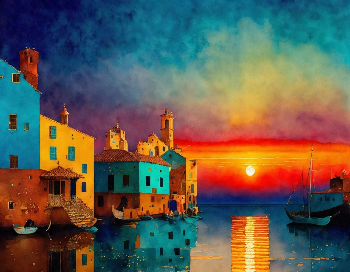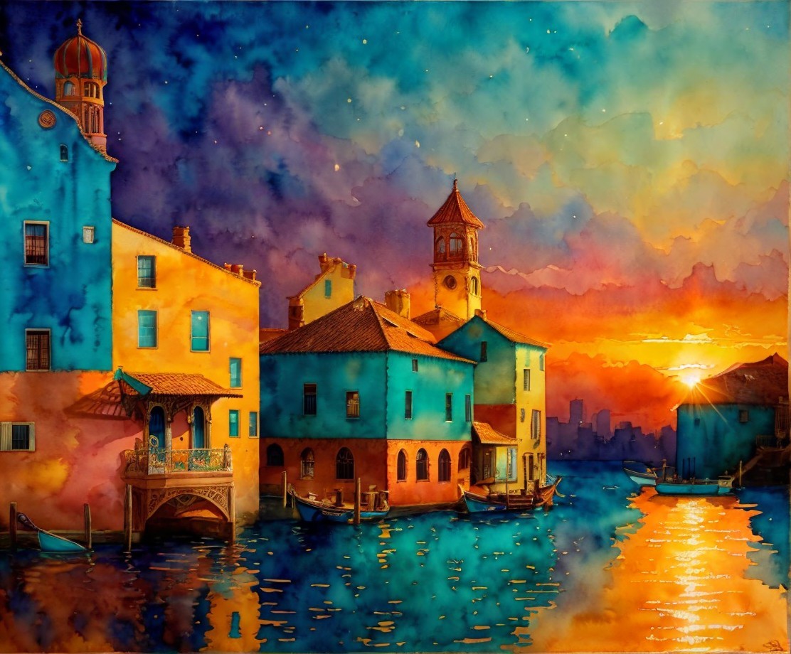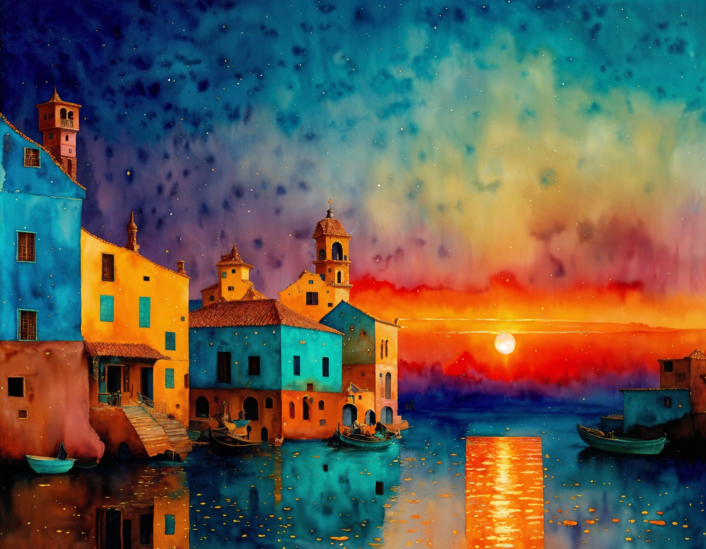 This vibrant watercolor scene depicts a picturesque waterfront village at sunset, with colorful buildings reflecting in the water, and dramatic clouds creating a stunning backdrop.