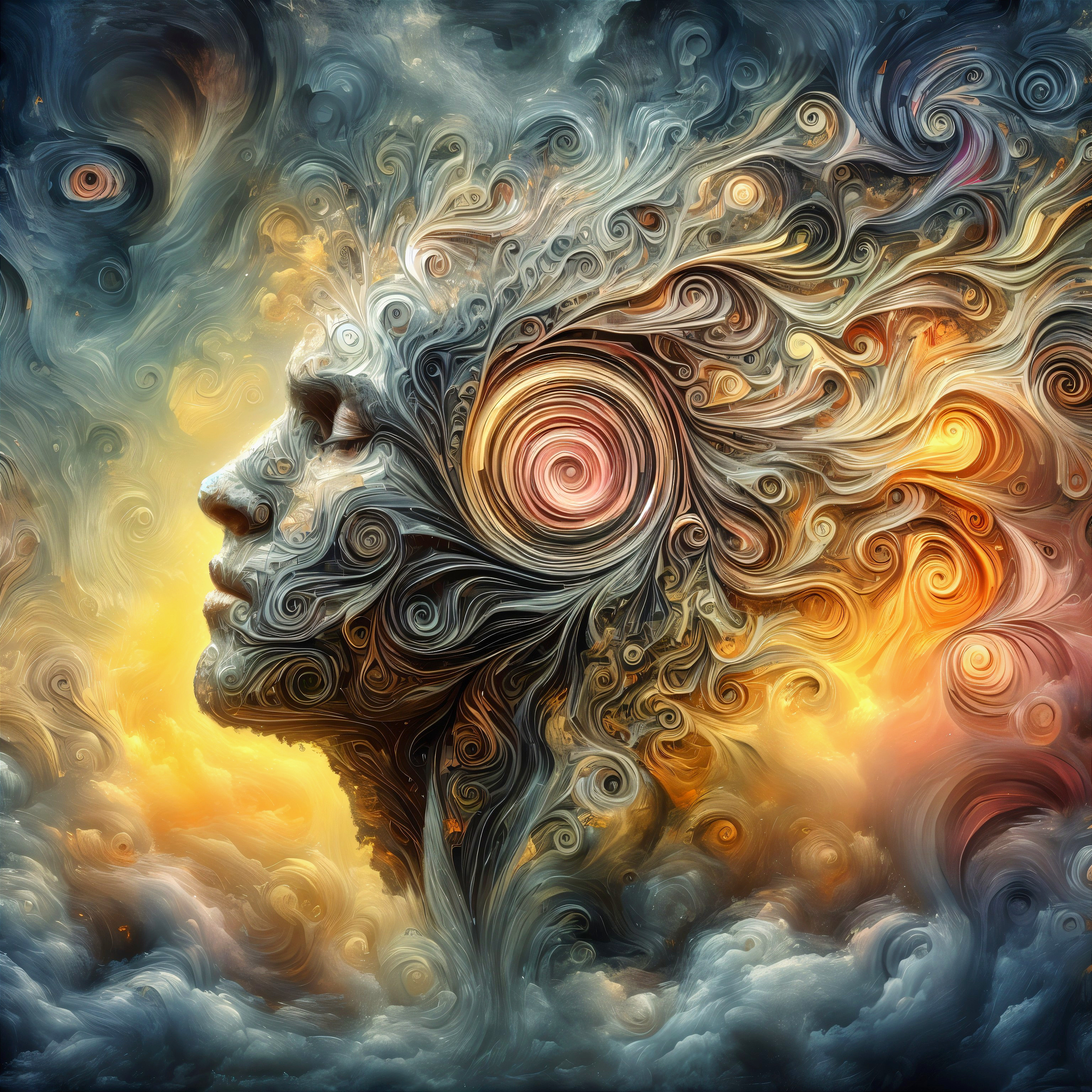 An abstract depiction of a serene face merging with swirling colors and patterns, symbolizing a dreamlike state. The background features vibrant hues of orange and gold, evoking warmth and tranquility.
