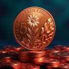 The image features a prominently displayed copper coin with intricate floral designs, surrounded by a stack of similar coins. The background is a soft, blurred gradient of blue and green hues.