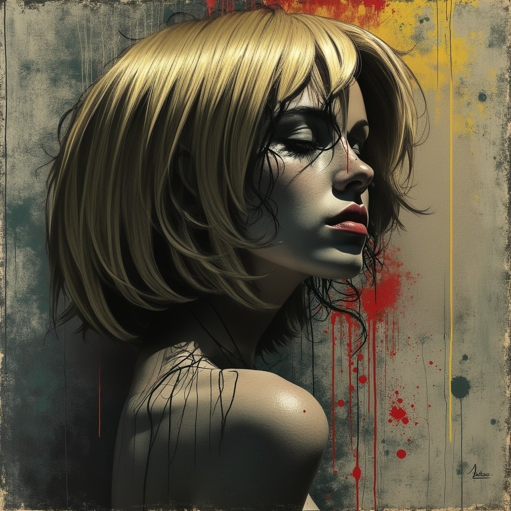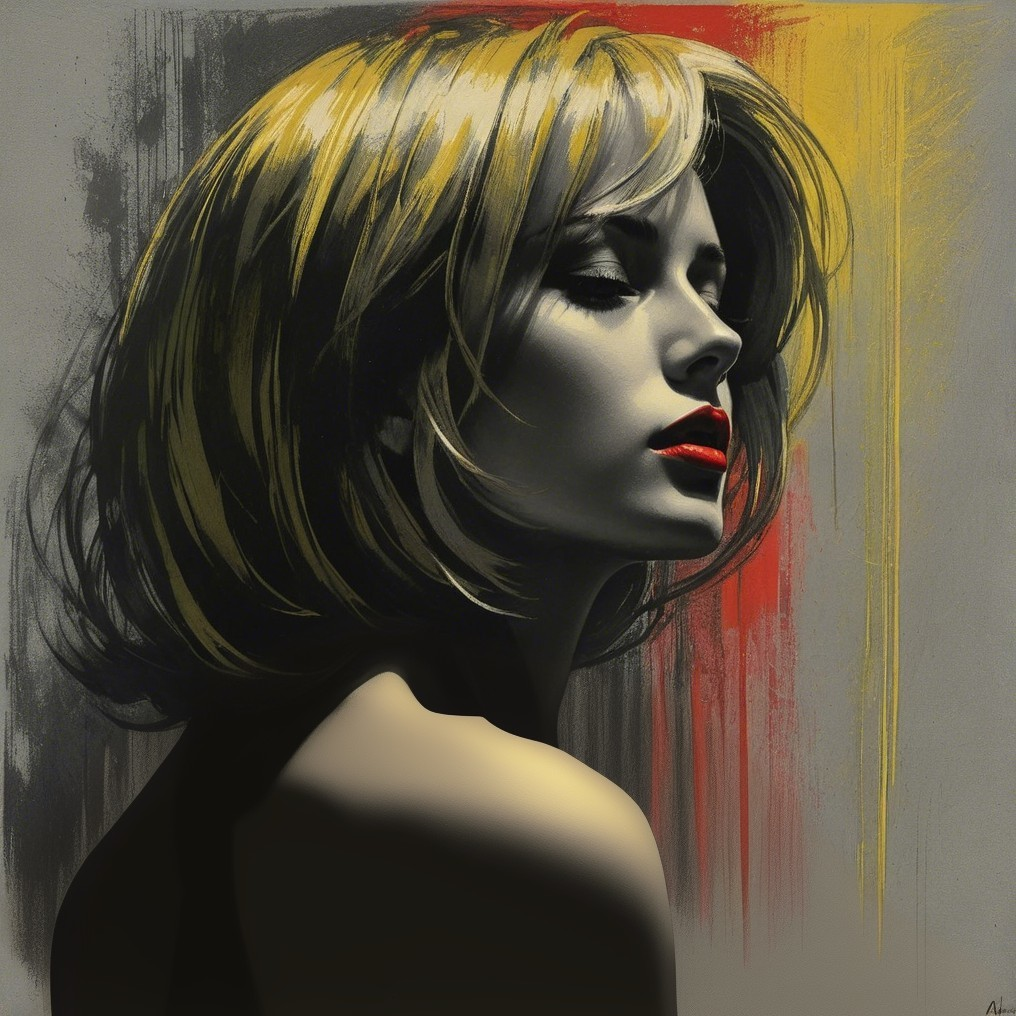 The artwork features a striking portrait of a woman with shoulder-length blonde hair and red lips. The background showcases bold splashes of yellow and gray, enhancing her elegant profile.