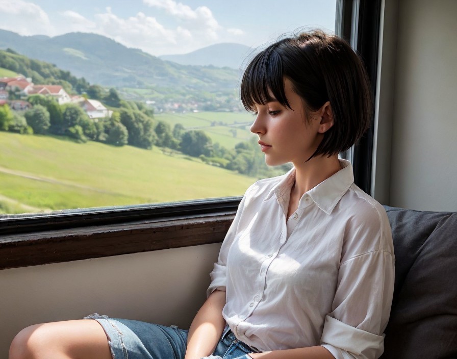 A woman with a bob haircut gazes down pensively near a window overlooking a serene, hilly landscape.