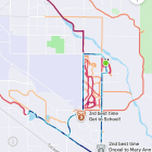 The image displays a colorful map of a park, with pathways, water bodies, and various symbols like stars and markers indicating points of interest, alongside navigational elements.