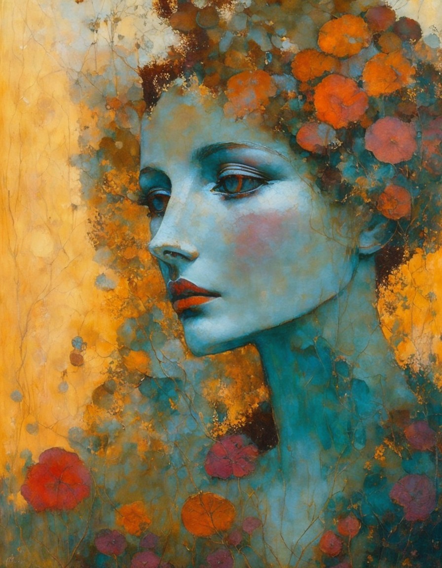 An artistic portrait of a woman with a melancholic expression, adorned with a floral headpiece, with a mosaic of warm colors in the background.