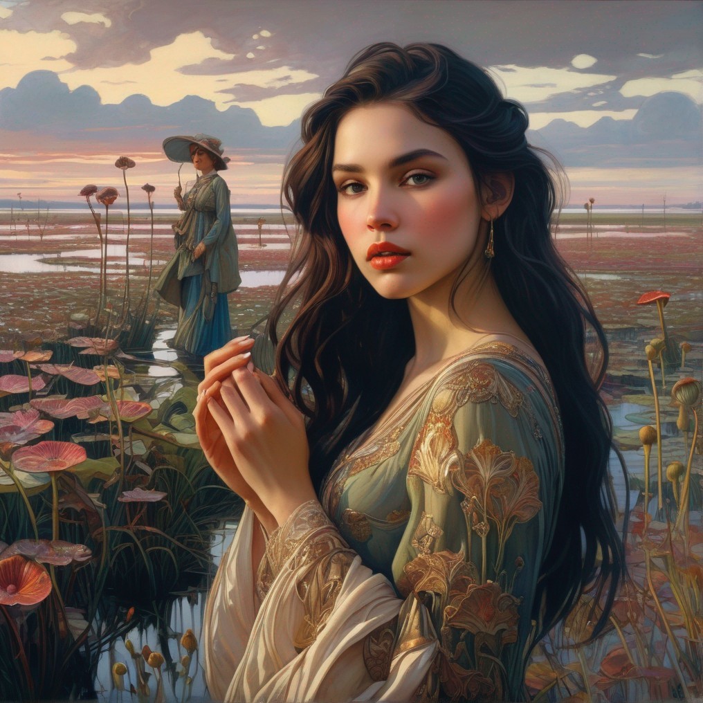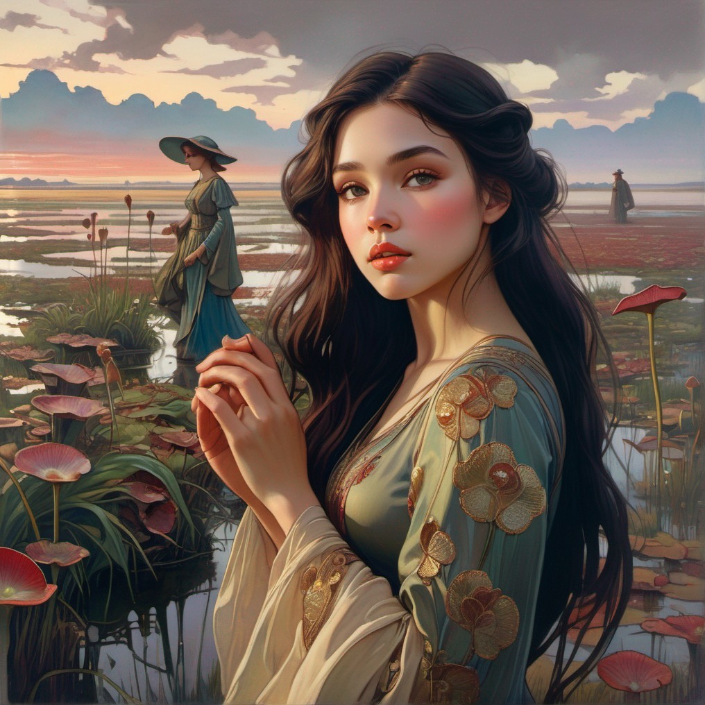 + Prompt:Art nouveau, a beautiful young woman walking in a wet marshland populated with carnivorous plants. style Alphonse Mucha and William Waterhouse and van Gogh, at sunset. Hyper-detailed, hyper-realistic, photo-realistic, ornate, meticulously detailed, vibrant colors, meticulous, intricate and highly detailed illustration, watercolour by jean-baptiste monge, by Arthur Rackham, by Paul Klee, hyper-realistic, ornate, meticulously detailed, intricate, highly detailed, illuminated, cinematic lighting. Extremely detailed. Masterpiece.
