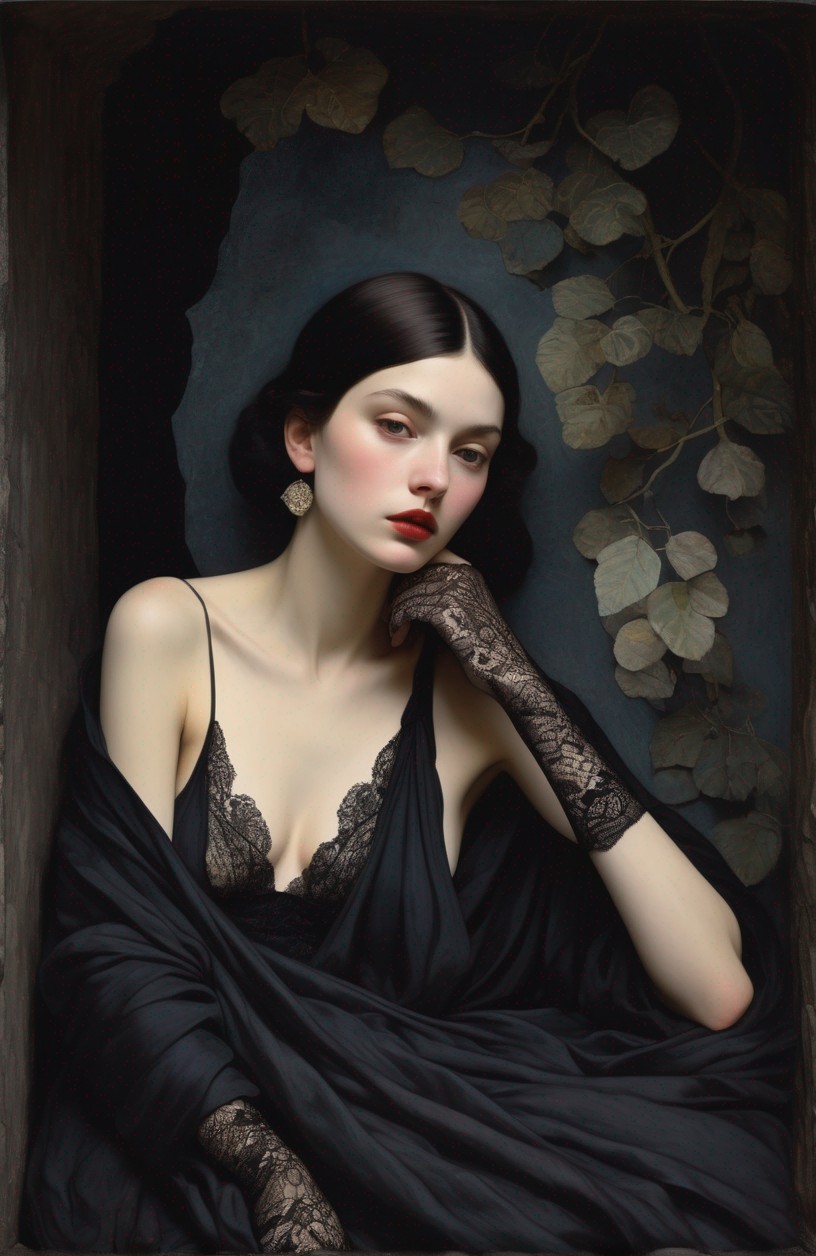 A woman in vintage attire sits by a table with a lit lamp, exuding a classic, contemplative ambiance.