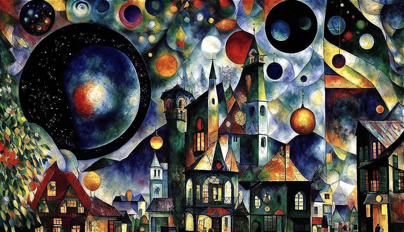 A vibrant, surreal landscape features whimsical buildings beneath a cosmic sky with colorful moons, stars, and planets, evoking a dreamlike atmosphere that blends reality and imagination.