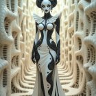 A futuristic humanoid robot stands elegantly in a surreal, organic corridor. Its sleek metallic body contrasts with flowing white fabric, while intricate details enhance its otherworldly appearance.