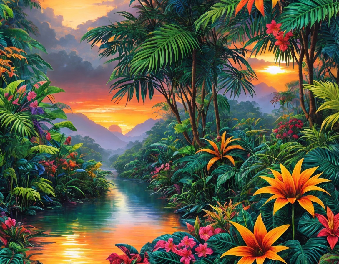 A vibrant tropical scene with lush foliage, vivid flowers, a serene river, and a radiant sunset.