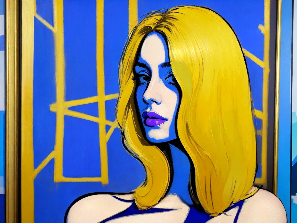 A portrait of a actress with blonde hair on stage under strong lighting casting blue shadows, set against a background stage set of blue with golden geometric shapes, creating a vibrant, modern aesthetic.