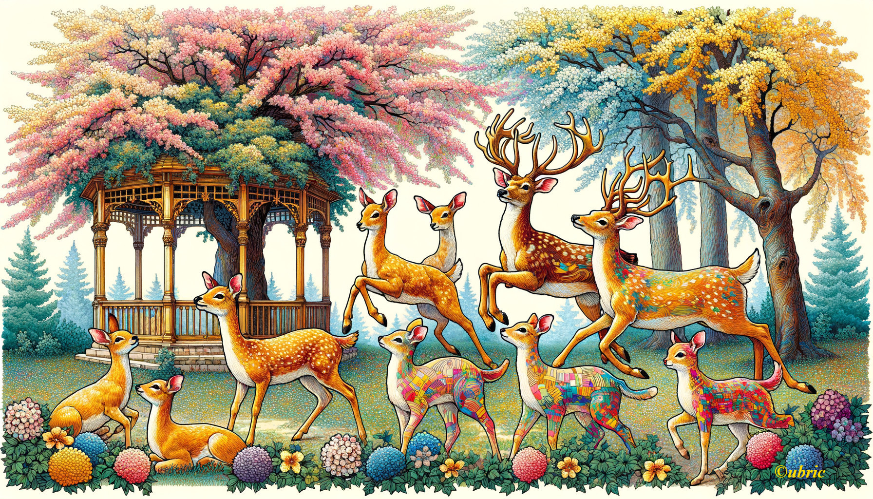A vibrant, colorful illustration featuring a group of deer in a floral forest with a gazebo, under a pastel-hued, tree-canopied sky.