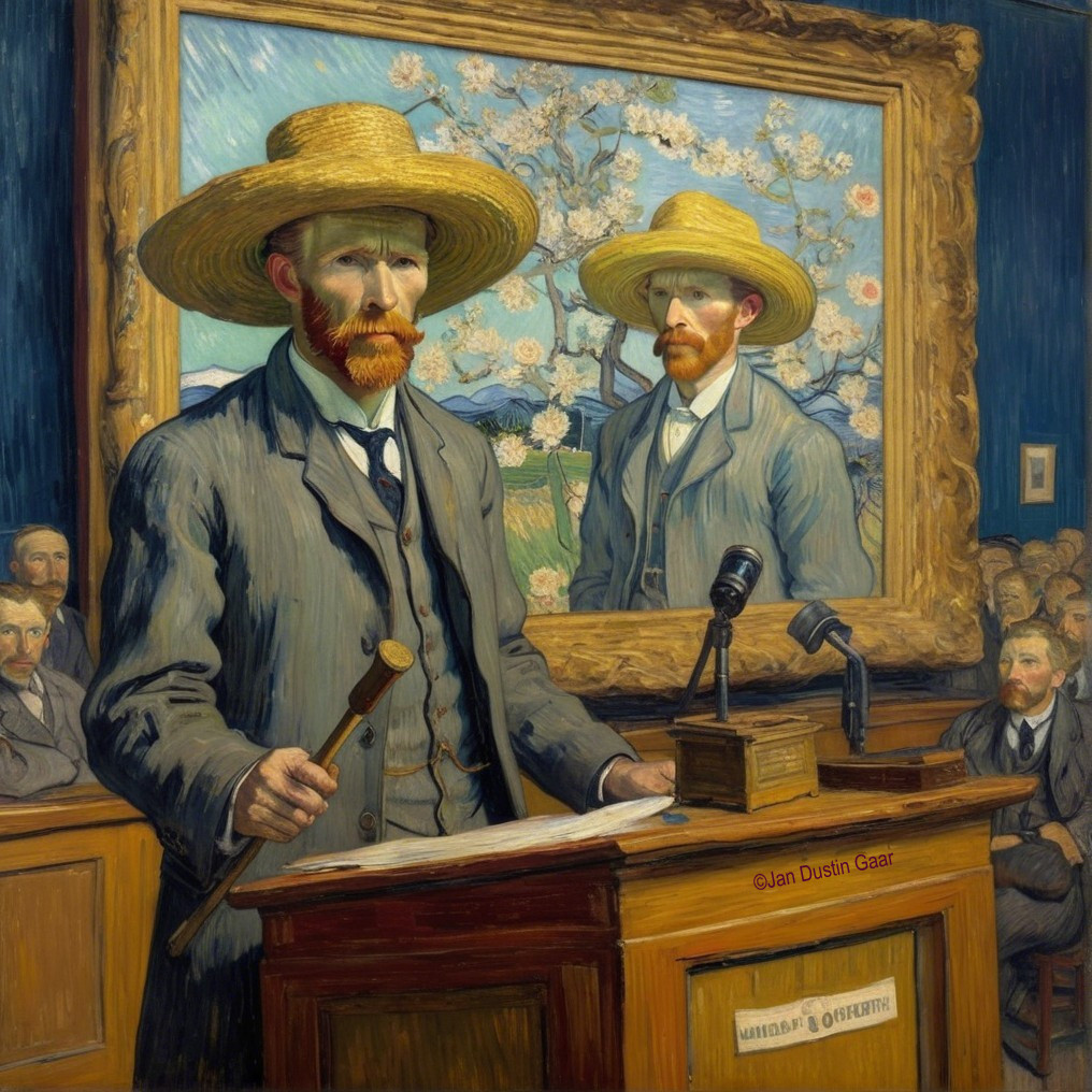 The image features van Gogh with straw hat at a podium, with a large self-portrait with branches in bloom behind him, surrounded by an audience in a gallery setting.