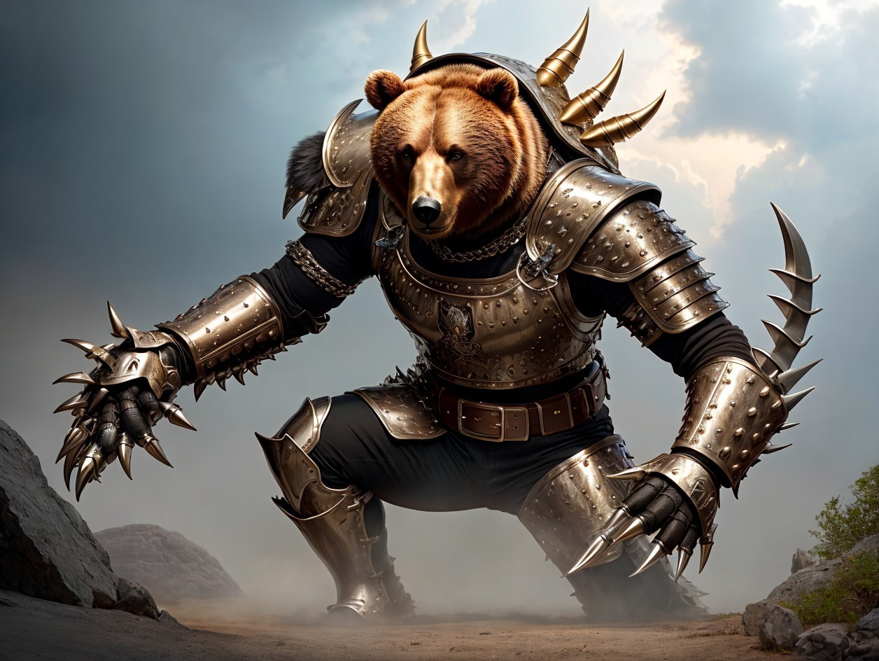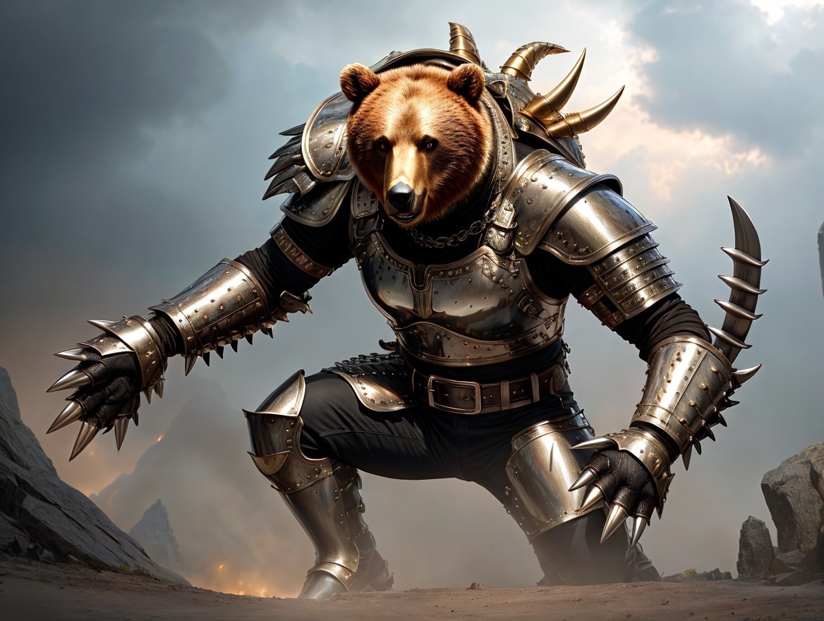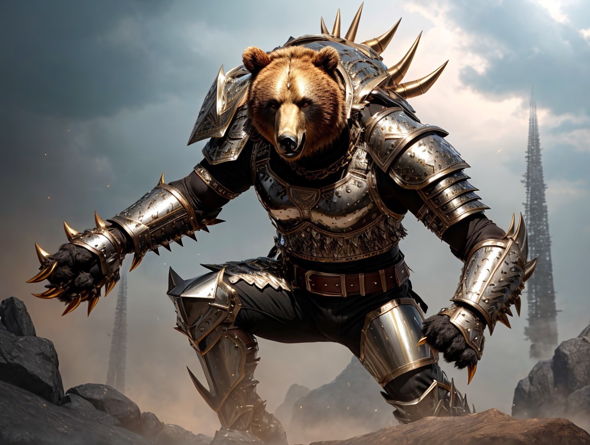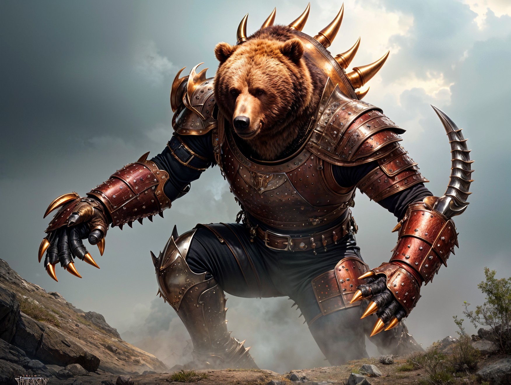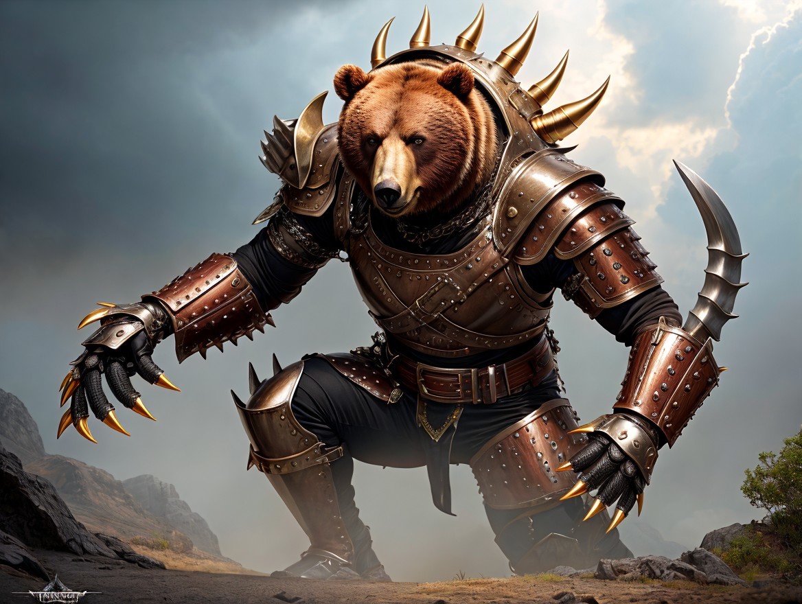 A massive bear-like creature in ornate, spiked armor crouches in a rugged landscape, wielding a curved blade. Dark clouds loom, creating a dramatic, intense atmosphere.