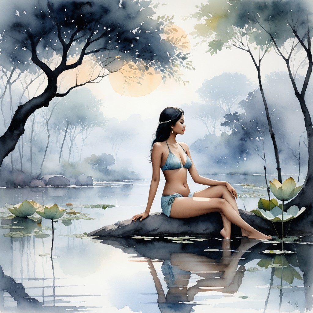 A serene scene captures a young woman in a bikini sitting on a rock by a tranquil waterway, surrounded by trees and lotus flowers, illuminated by a soft, glowing moon in the background.