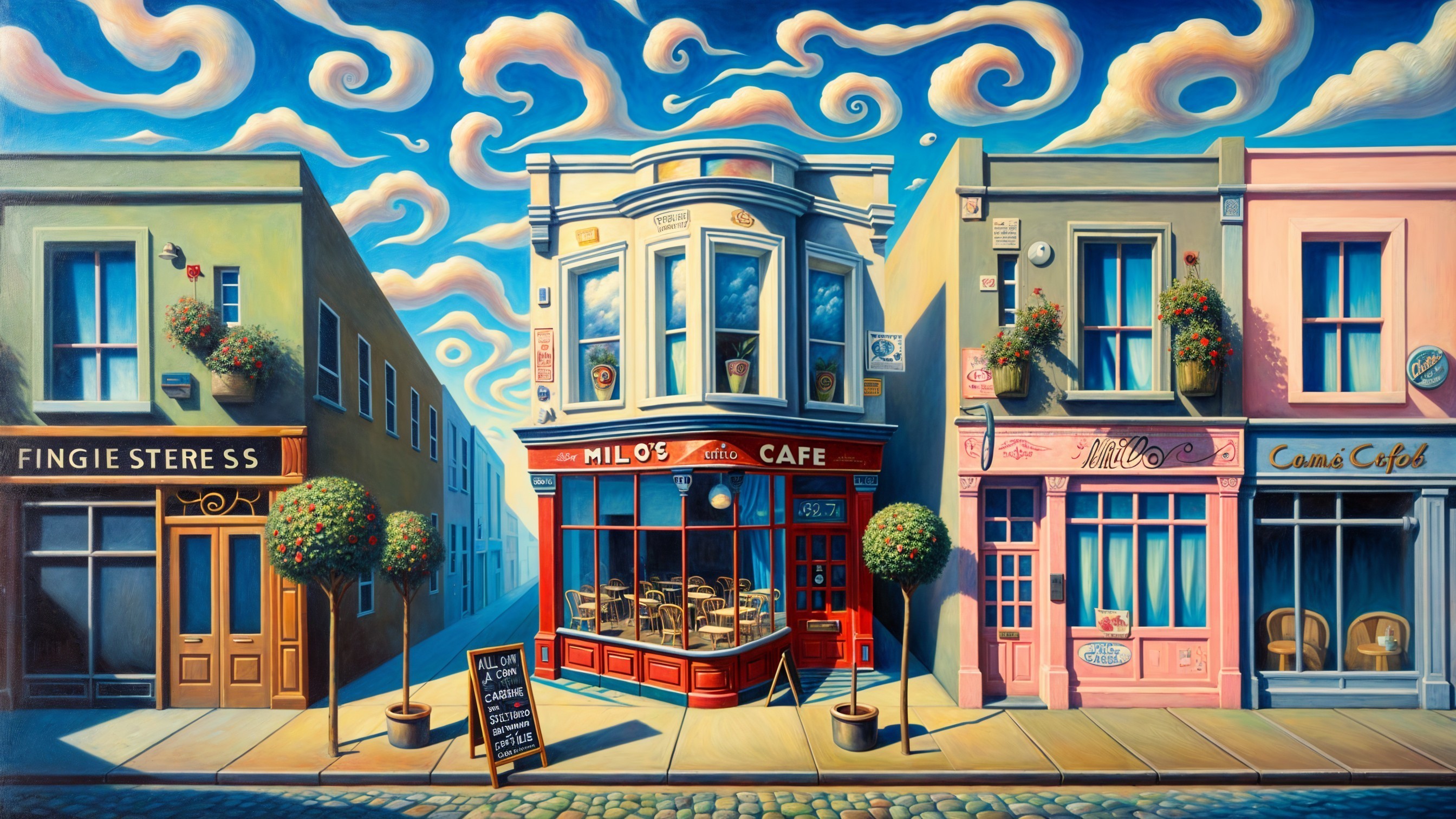 A vibrant street scene features a charming café with a red exterior, bustling patrons enjoying tea, and pedestrians strolling along cobblestone paths, set against colorful, quaint buildings.