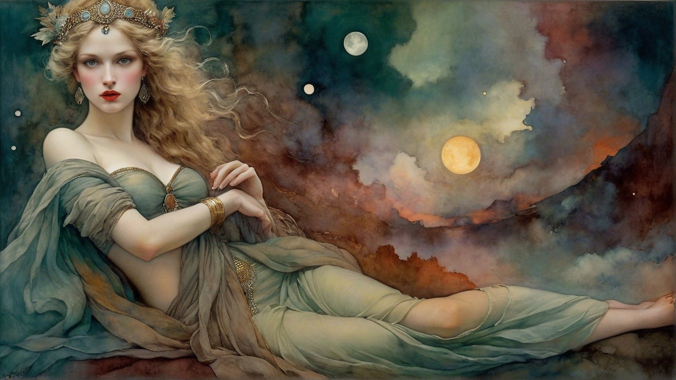 Ancient cities, ancient tales. Ancient spirits Beautiful exotic woman. Arthur Rackham Paul Klee Norman Rockwell anatomically correct Steve Hanks muted tones symmetrical face Ochre Big brown eyes Subdued palette wide open dark eyes Symmetrical eyes, nose and mouth moody, somber, desaturated colors Soft, somber, delicate Soft dappled lighting. Golden hour. Leonardo, Durer, Schiele, Degas, Mondrian - mixed media surreal Richard Burlet celestial Enki Bilal dynamic pose Esao Andrews enigmatic dreamy atmosphere susanne Jamie Heiden cosmic splendor Surreal dream In the darkness I dance