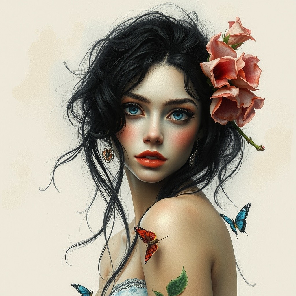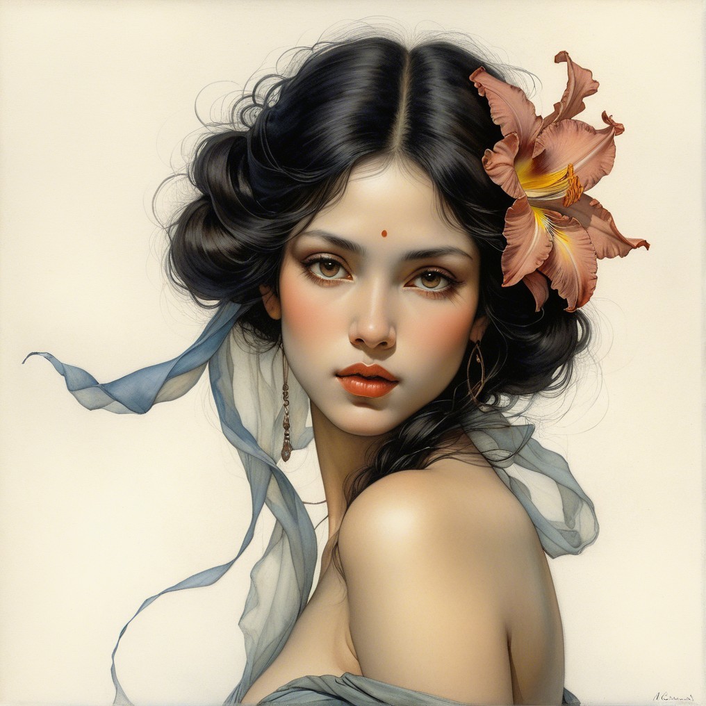 A portrait of a woman with dark hair, wearing earrings, a teal garment, and flowers in her hair, gazing intensely at the viewer.