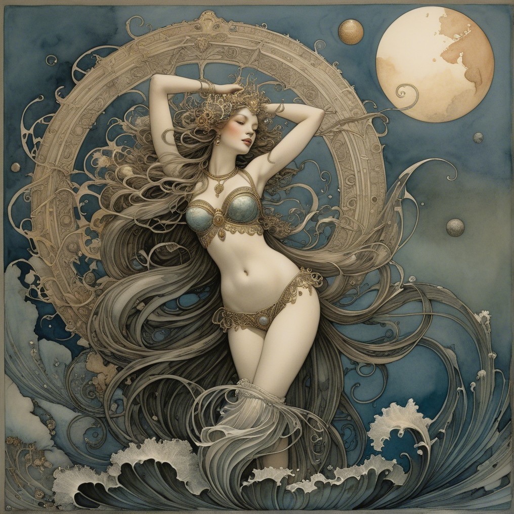 A graceful figure dances amidst swirling waves, adorned with intricate jewelry. Her flowing hair and delicate movements evoke a dreamy, ethereal atmosphere under a glowing moon.