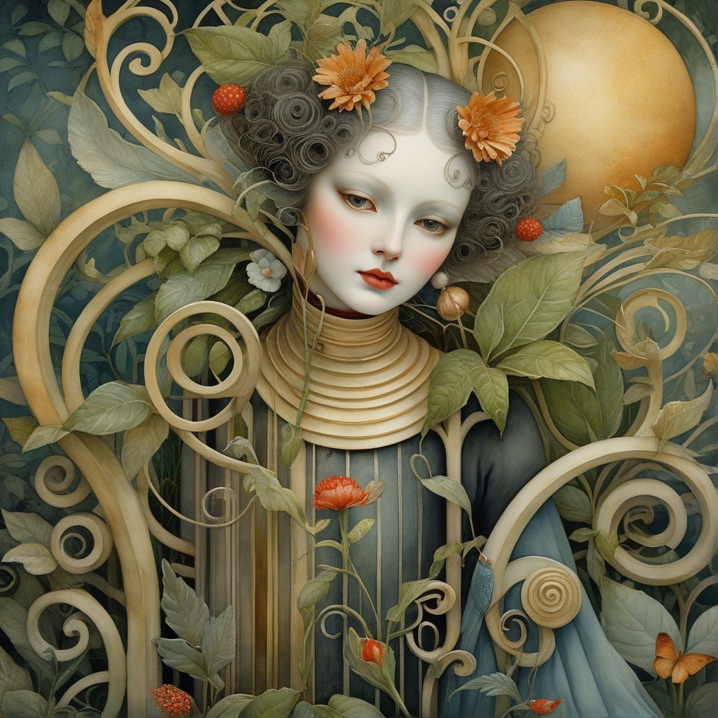 + Prompt:Close up, impish beautiful white-faced parisian creature in a garden wonderland labyrinth, in the style of Wolfe von lenkiewicz. by Catrin Welz-Stein, Michael Parkes 3d, extremely detailed, beautiful, watercolor and ink, mixed media, Best quality, Very high definition, super clear resolution, cinematic, intricate, fantastic view, beautiful, dynamic lighting, high definition, hdr *Random prompt award winning Max Ernst ultra detailed, 4K 3D, Texture