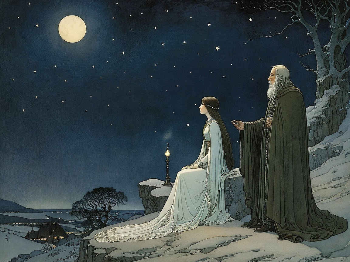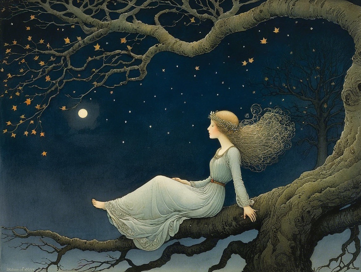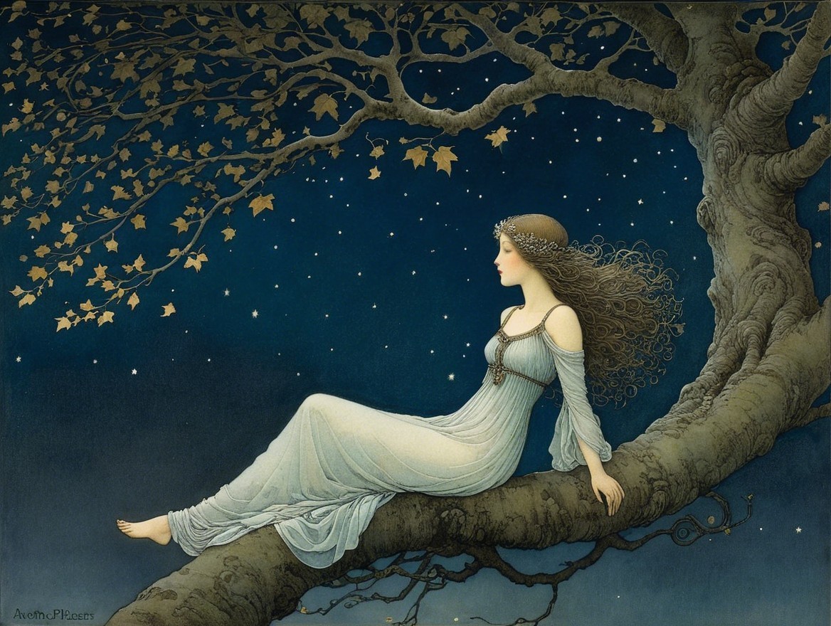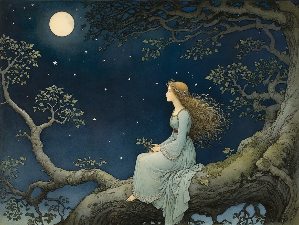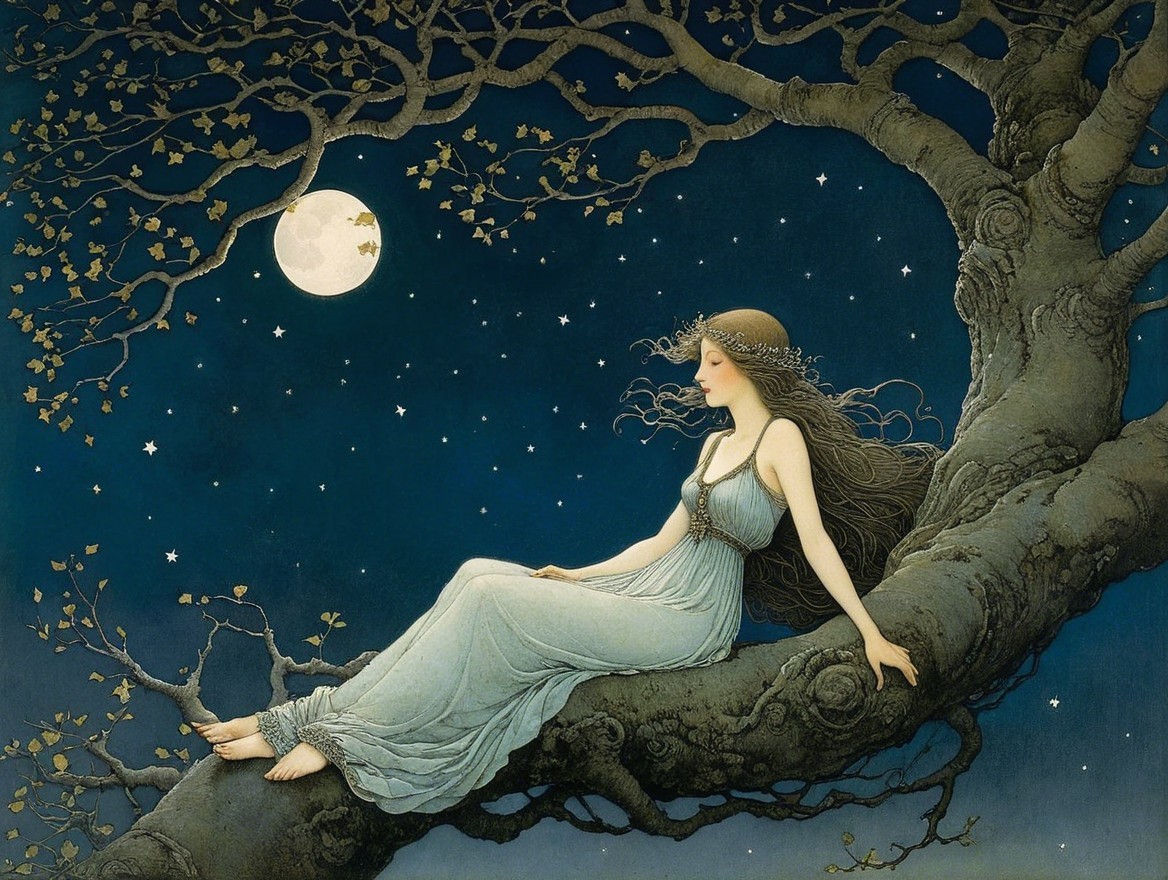 A serene woman in a flowing gown sits on a gnarled tree branch under a full moon, surrounded by a starry night sky, embodying tranquility and ethereal beauty.