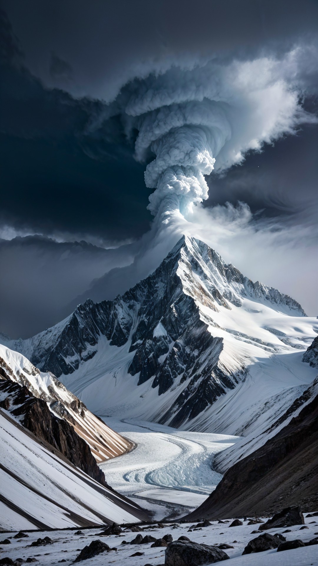 A dramatic scene captures a towering mountain with a volcanic plume emitting from its peak, surrounded by icy glaciers and dark stormy skies, creating a stark contrast of nature's power.