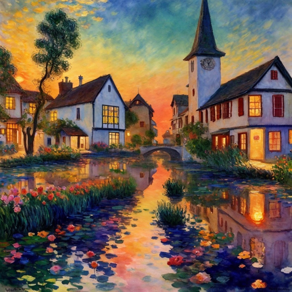 Scenic painting of illuminated village at dusk