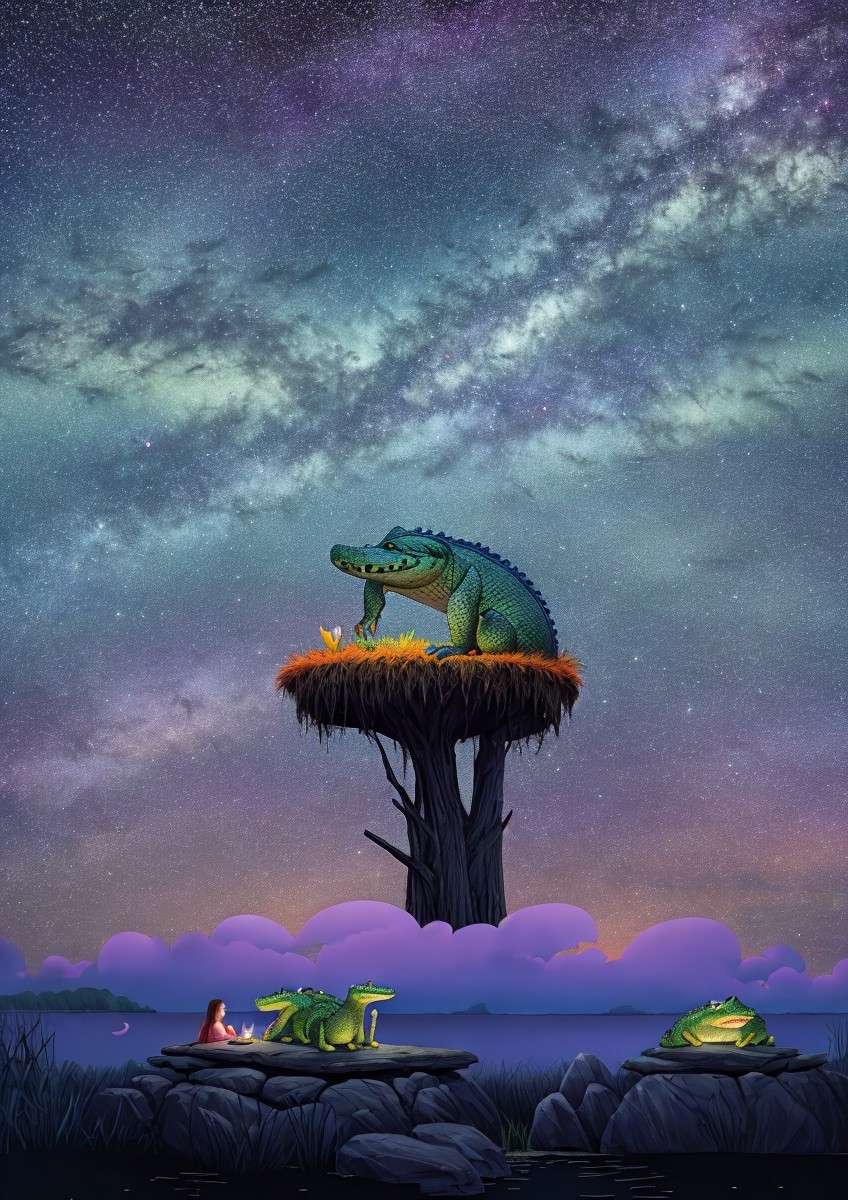 A whimsical illustration of a person and a creature sitting by a pond under a starry sky with a large moon and a sun setting or rising.